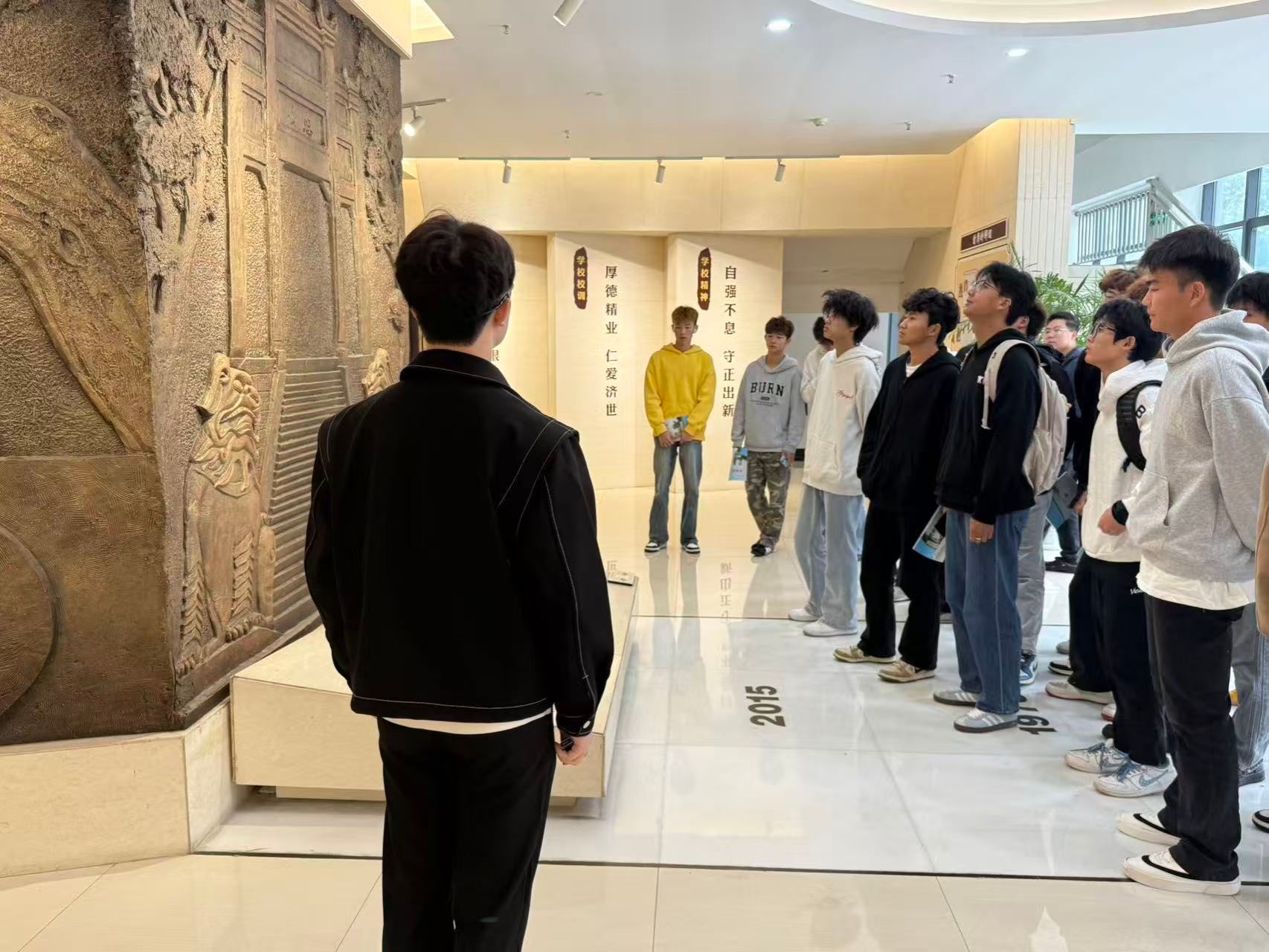 在讲解员的引导下,同学们循着历史足迹浏览了校史馆的七大展区,开启了一场沉浸式学习之旅,通过实物展品、图文展板、多媒体影像等多元形式,系统呈现了学校发展的光辉历程。参观过程中,同学们不时驻足观看,认真聆听讲解,并积极与讲解员互动交流。