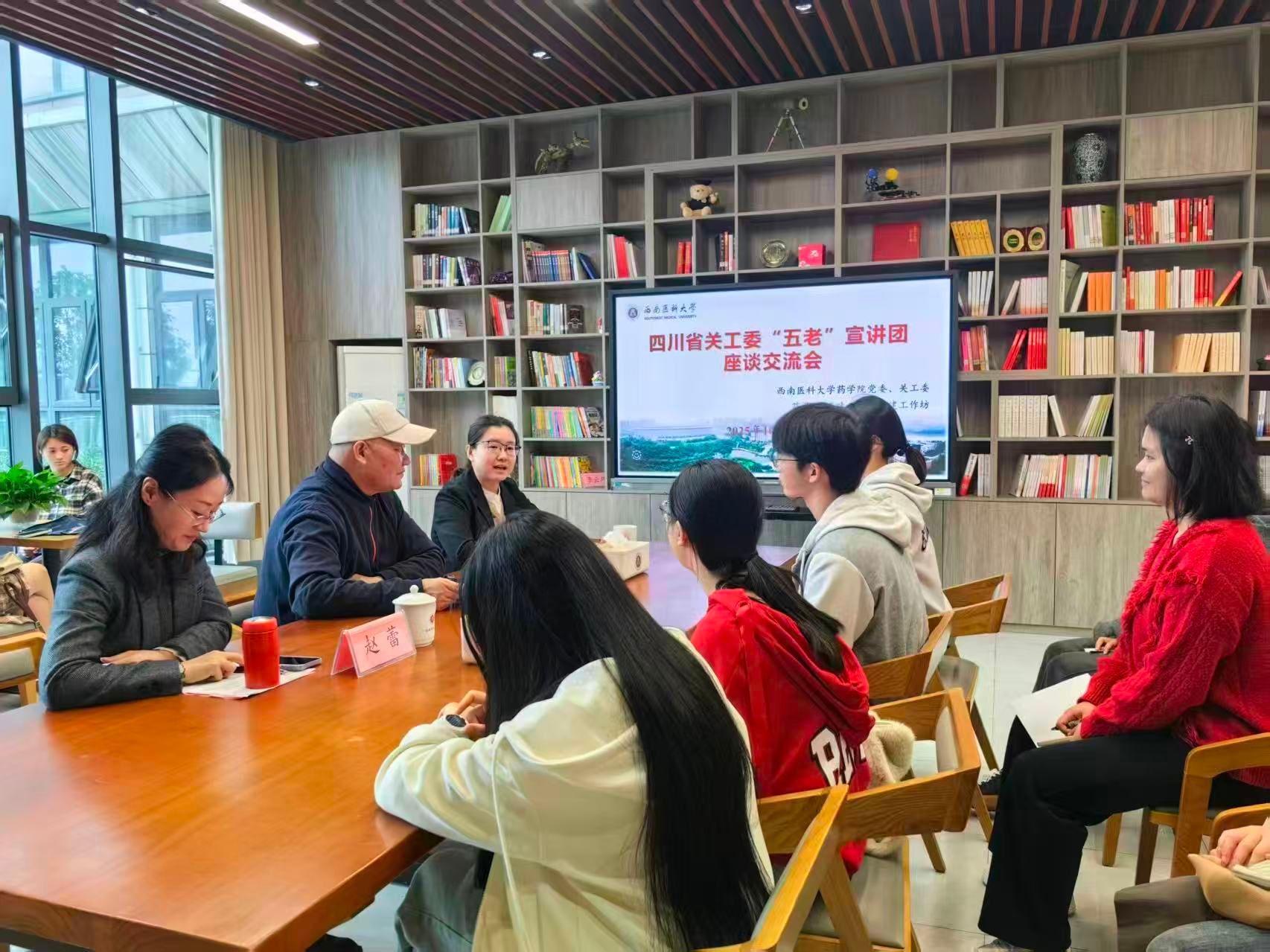 10月25日,药学院在弘润楼127开展四川省关工委“五老宣讲团”座谈交流会,会议由四川省关工委“五老宣讲团”成员、学校关工委常务副主任、泸州市诗词学会会长尹杰霖书记主讲,药学院党委书记唐艳斌,党委副书记、纪委书记赵蕾,学生科副科长李云巧,以及来自药学院3个专业、4个年级的共26名学生代表参与。