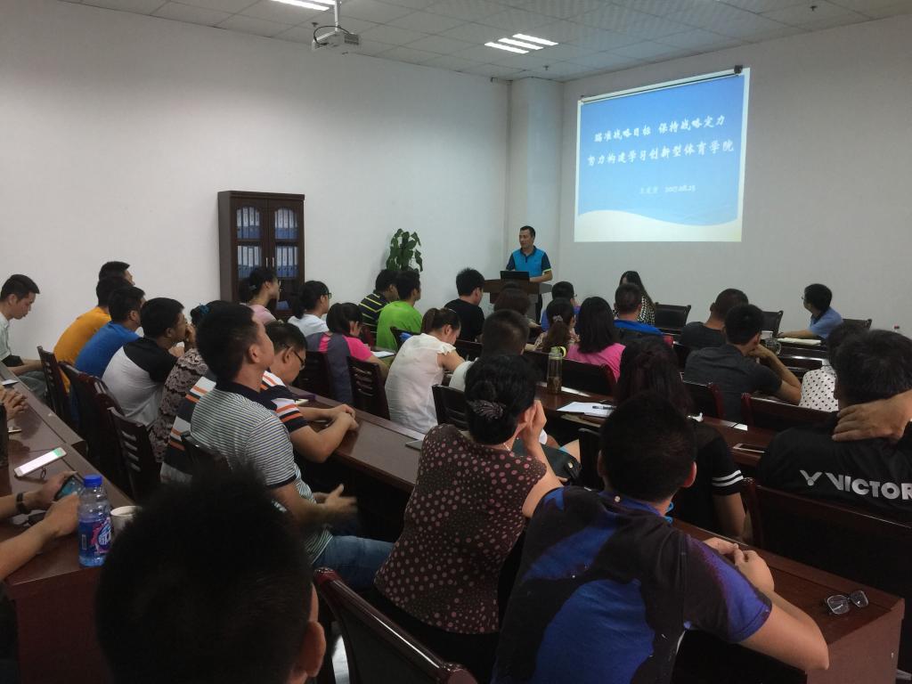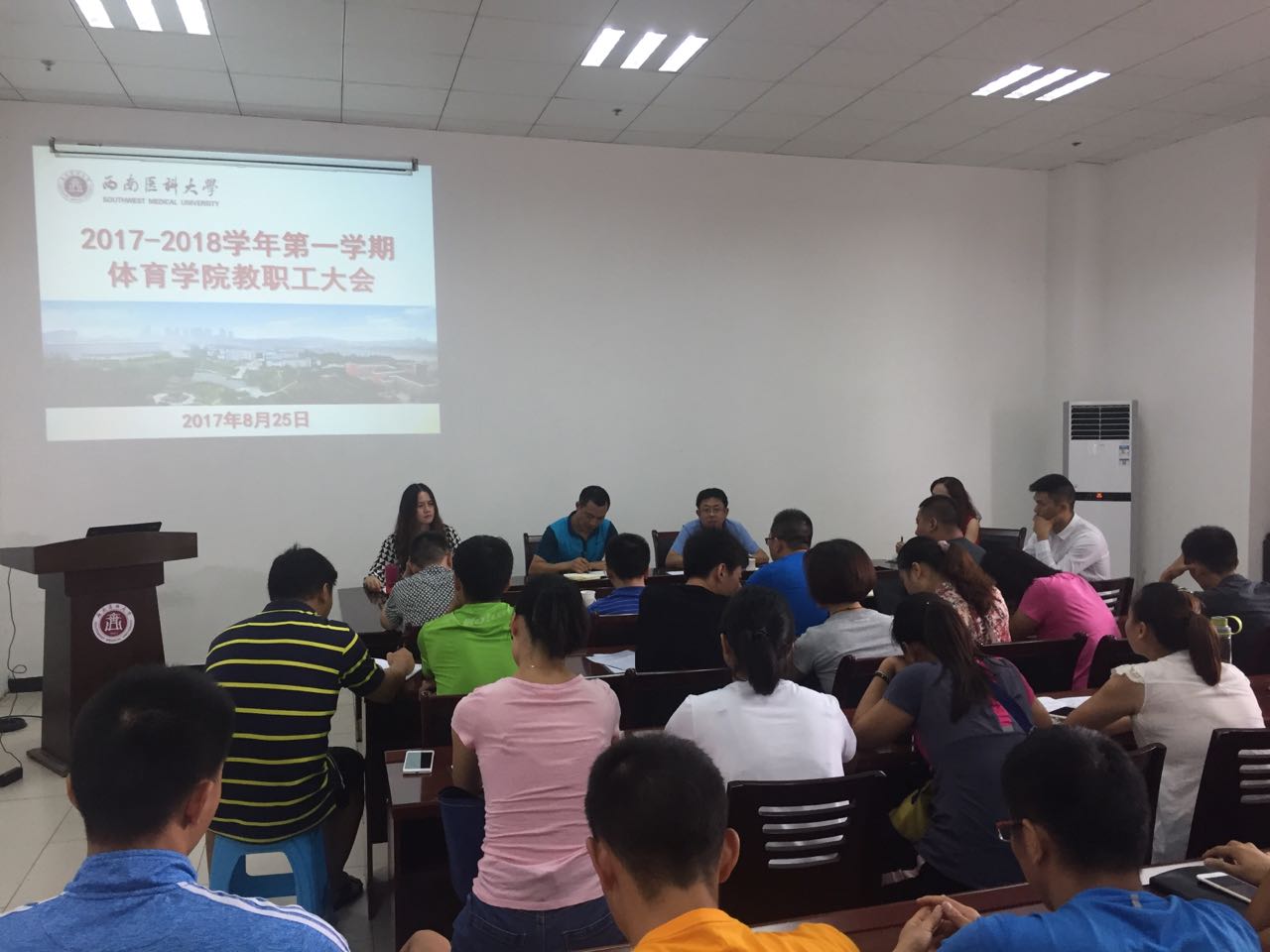 8月25日上午,体育学院召开2017-2018学年第一学期教职工大会,体育学院处科级干部及全体教职工参加了本次会议,学院党总支书记孔晓明主持大会。