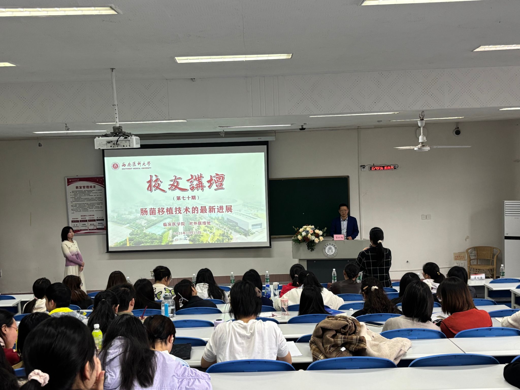 10月25日,西南医科大学第七十期校友讲坛在忠山校区临床第十一阶梯教室顺利举行。本次活动由临床医学院、对外联络处主办,临床医学院分团委·学生会协办,特邀医学系90级校友,武警特色医学中心消化内科兼内镜中心主任,主任医师,教授,博士,博士研究生导师,博士后合作导师夏时海担任主讲,围绕“肠菌移植技术的最新进展”展开了一场深入浅出、精彩纷呈的学术报告。