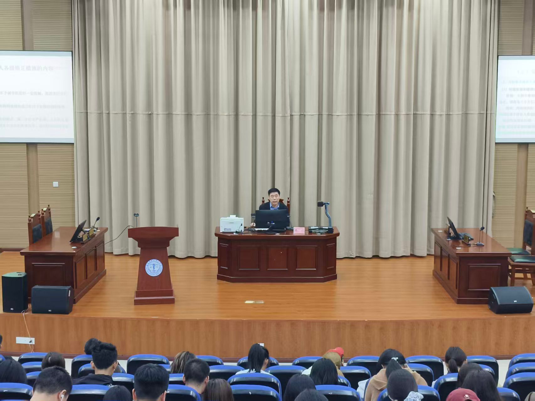 10月28日,由西南医科大学法学院、四川医事卫生法制研究中心、医学与法学期刊、西南医科大学司法鉴定中心主办,学校医事法律研究会、“崇法善治”辅导员工作室承办的“医学与法学”论坛第137讲,在城北校区模拟法庭举行。中国律师法学研究会副会长、中国犯罪学学会常务理事、广西商法学研究会常务理事、广西民族大学法学院学科带头人、博士生导师廖斌教授担任主讲,他以“涉罪未成年人分级矫正制度探究”为题,为法学院师生带来了一场学术盛宴。法学院先德奇副院长主持,吸引了二百余名师生的参与。