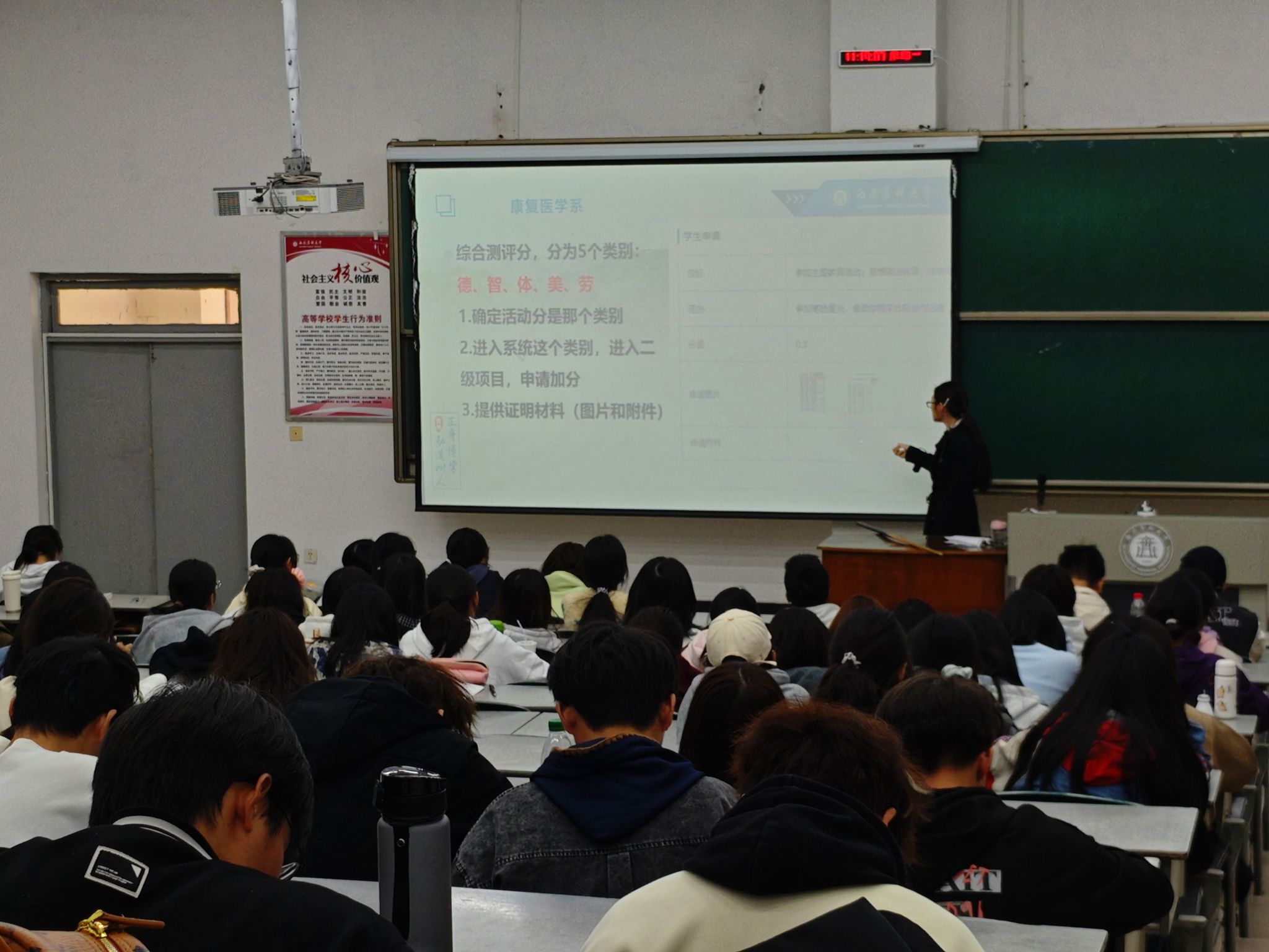 为深入贯彻党的教育方针,进一步加强学风建设,鼓励学生勤奋学习,引导学生全面发展,10月27日,康复医学系开展了学生综合素质测评管理条例宣讲会。本次宣讲会由康复医学系学生科科长侯萍主讲,康复医学系全体在校学生参加。