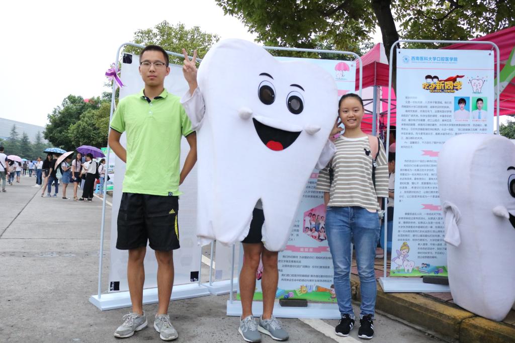 9月2日清晨7点,报道接待站所有人员及物资到位,做好了迎接新生“主力军”的准备。院党委书记李正新、副书记徐茜,学生科科长罗茂璇,辅导员刘星宇现场主持迎新工作。院系领导同新生及其家长热切交谈,对他们表示衷心诚挚的欢迎,为他们送去路途跋涉的抚慰,并对他们提出的涉及学习生活方方面面的问题进行耐心解答。淅淅沥沥的小雨丝毫没有浇灭学长学姐迎新的热情。接过行李,带领引路,交流介绍,绿衣白裙的口腔志愿者们忙碌地穿梭于人海之中,带领新生走近全新的大学生活,向全校展现出口腔人团结友爱的精气神。报道接待站更是准备了泸州特产桂圆,贴心的细节让新生感到如家的温暖。而两个极具口腔特色的牙齿人偶手舞足蹈,活泼可爱,吸引了许多新生与之合影,融洽欢乐的场景成为招新现场最亮眼的一道风景。晚7点,随着院领导走访了所有新生宿舍,亲切慰问新同学,2017年迎新工作圆满结束。