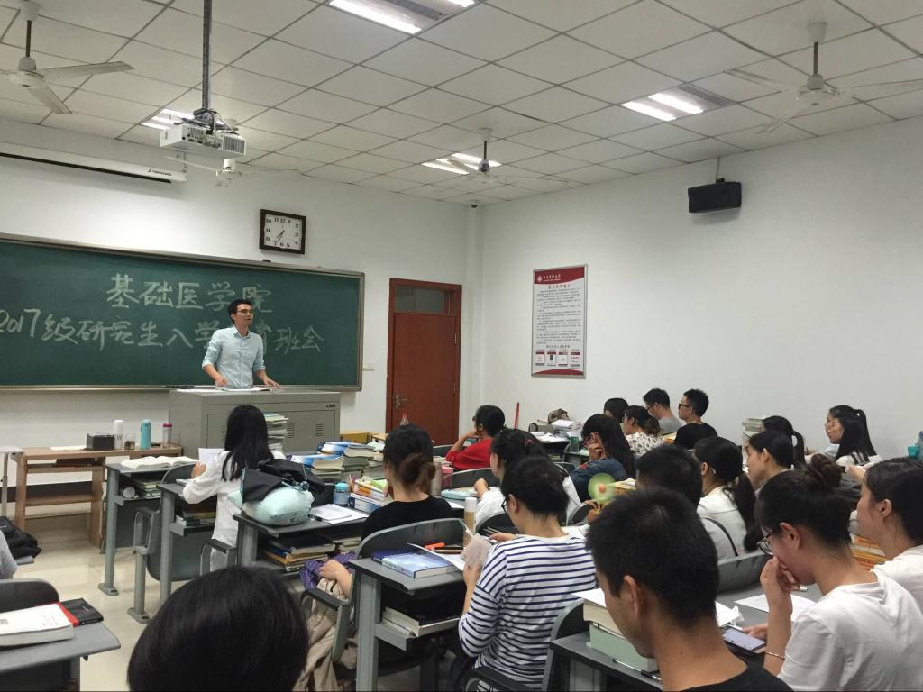 9月5日晚7点,基础医学院在忠山校区粒香园404教室召开了2017级研究生入学教育班会。2017级研究生全体参加,会议由研究生科科长谢茂主持。