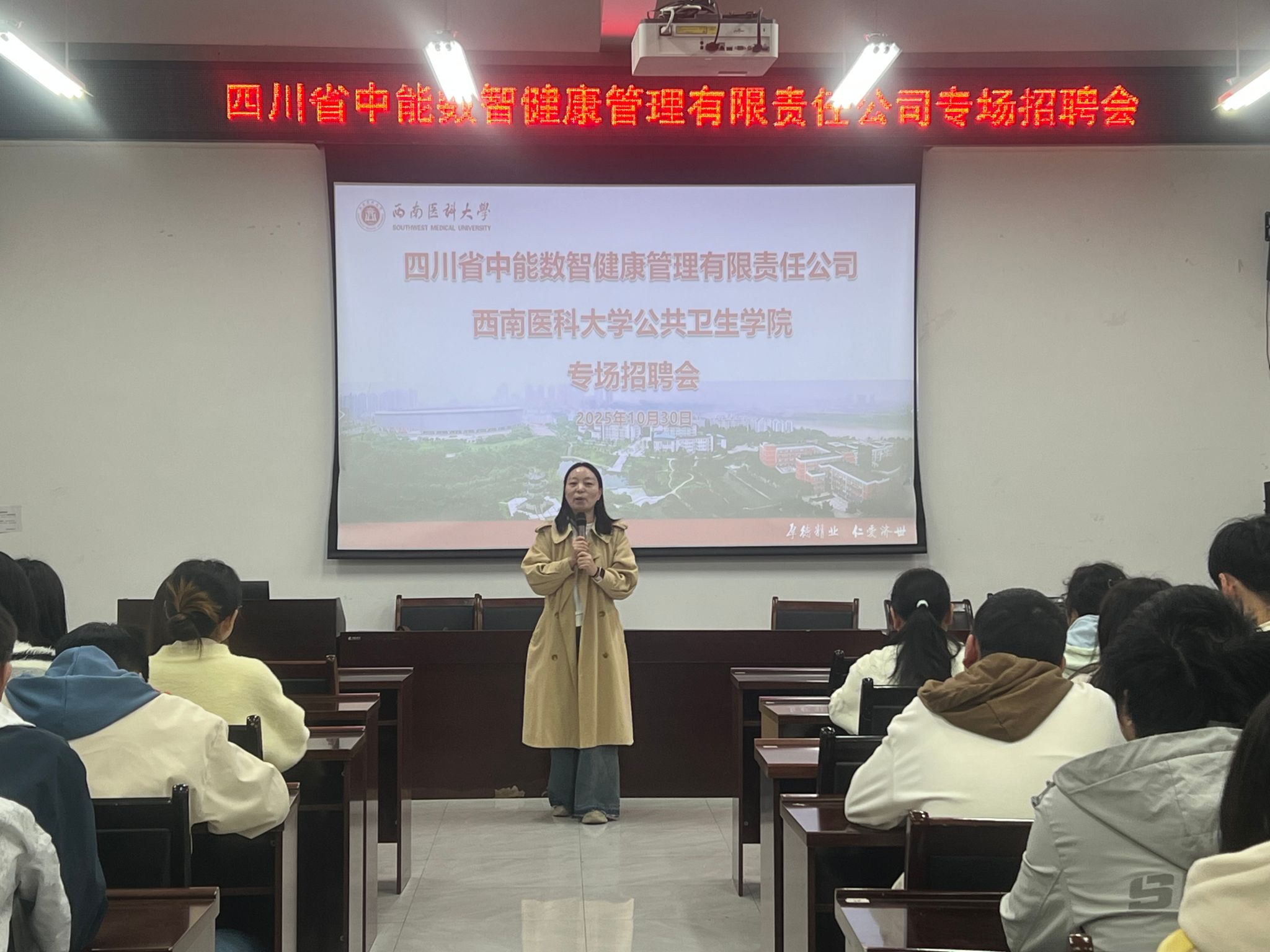 为进一步拓宽毕业生就业渠道,搭建校企合作桥梁,10月31日,公共卫生学院在319会议室举办四川省中能数智健康管理有限责任公司专场招聘会。2026届预防医学、卫生检验与检疫及食品卫生与营养学等专业百余名毕业生参加。