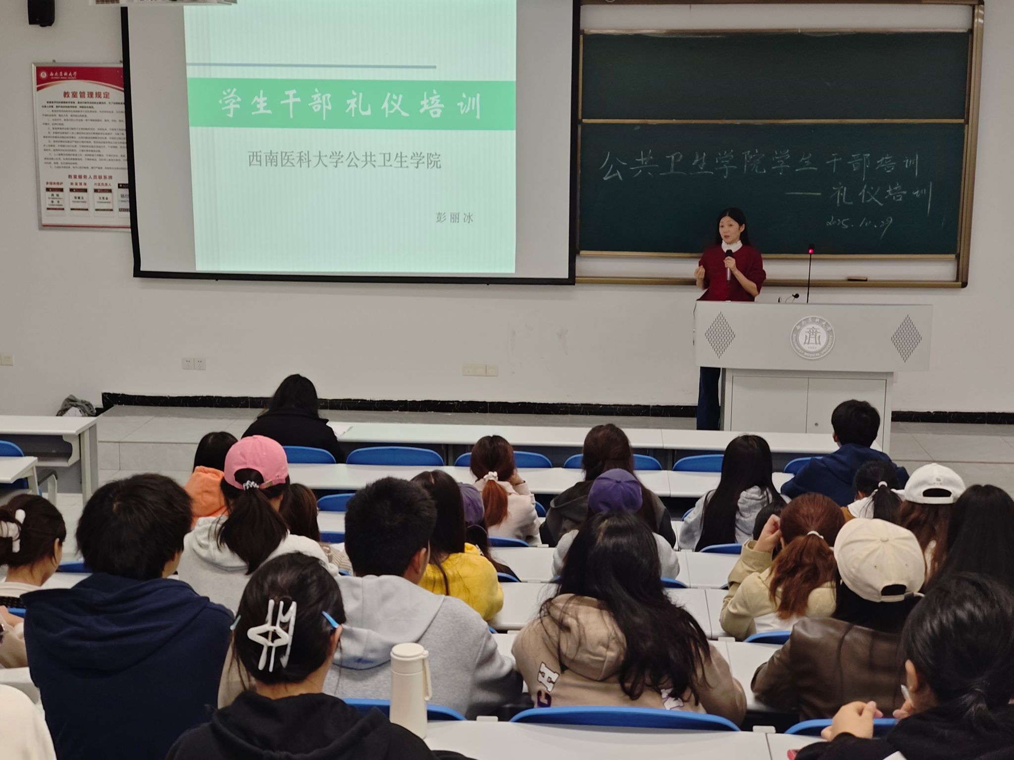 为加强学生干部队伍建设,进一步提升服务意识与综合能力,10月29日,公共卫生学院在学海楼502教室成功举办学生干部礼仪培训会。本次培训特邀学院学生科科长彭丽冰担任主讲,全院学生干部积极参与,现场学习氛围浓厚。