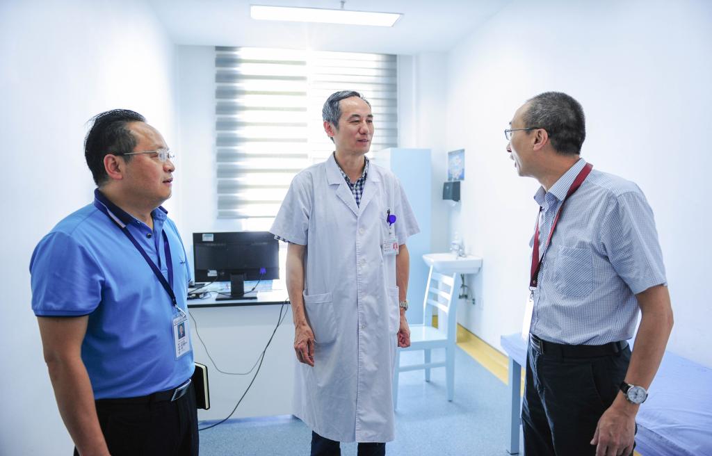 在医院门诊六楼肝胆外科诊室,学校教学名师雷正明教授正在值守午间门诊,惠曦一行为雷教授带去祝福;在医务部会议室,惠曦一行为正在参加医院医疗督导专家会议的省教学名师罗兴林教授带去祝福;同时电话慰问了在外出差的学校教学名师陈跃教授,对他们长期以来对医院教学事业的辛勤付出表示衷心的感谢。