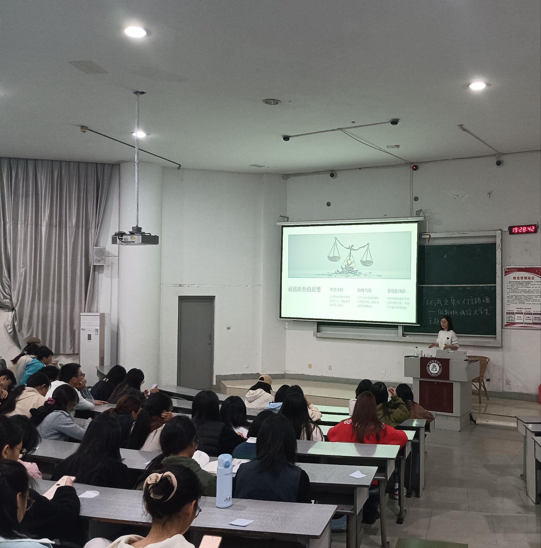 为引导同学们树立诚信意识,涵养诚信品格,争做新时代合格大学生,11月3日,公共卫生学院在明理楼105教室举办了“以诚立身,以信铸魂”主题活动讲座。讲座由学生科辅导员袁子璐主讲,学院共一百余位同学参加。