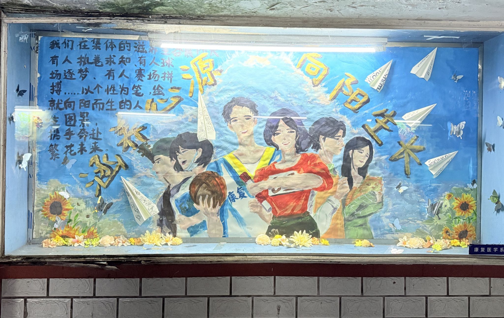 本次展览围绕“心灵疗愈”与“成长赋能”两大主题,将康复医学的专业理念与艺术表达有机融合。在筹备过程中,同学们利用课余时间积极参与创作。调配色彩、勾勒形象、折叠纸飞机、点缀向日葵等每一处细节都凝聚着同学们的用心与创意。最终呈现的橱窗画面以蔚蓝晴空为背景,生动刻画了在不同场景中奋发向上的青年群像——有潜心阅读的求知者,有球场挥洒的奔跑者,也有赛场拼搏的竞技者,展现出康复学子多元成长、向阳而生的精神风貌。展览中,象征希望与成长的元素贯穿始终。展翅的纸飞机承载美好愿景,绽放的向日葵传递温暖力量,翩飞的蝴蝶寓意破茧成长。这些意象将“接纳自我、逐光而行”的心理健康理念融入艺术创作,使驻足观赏的师生在视觉之美中感受到心灵触动。