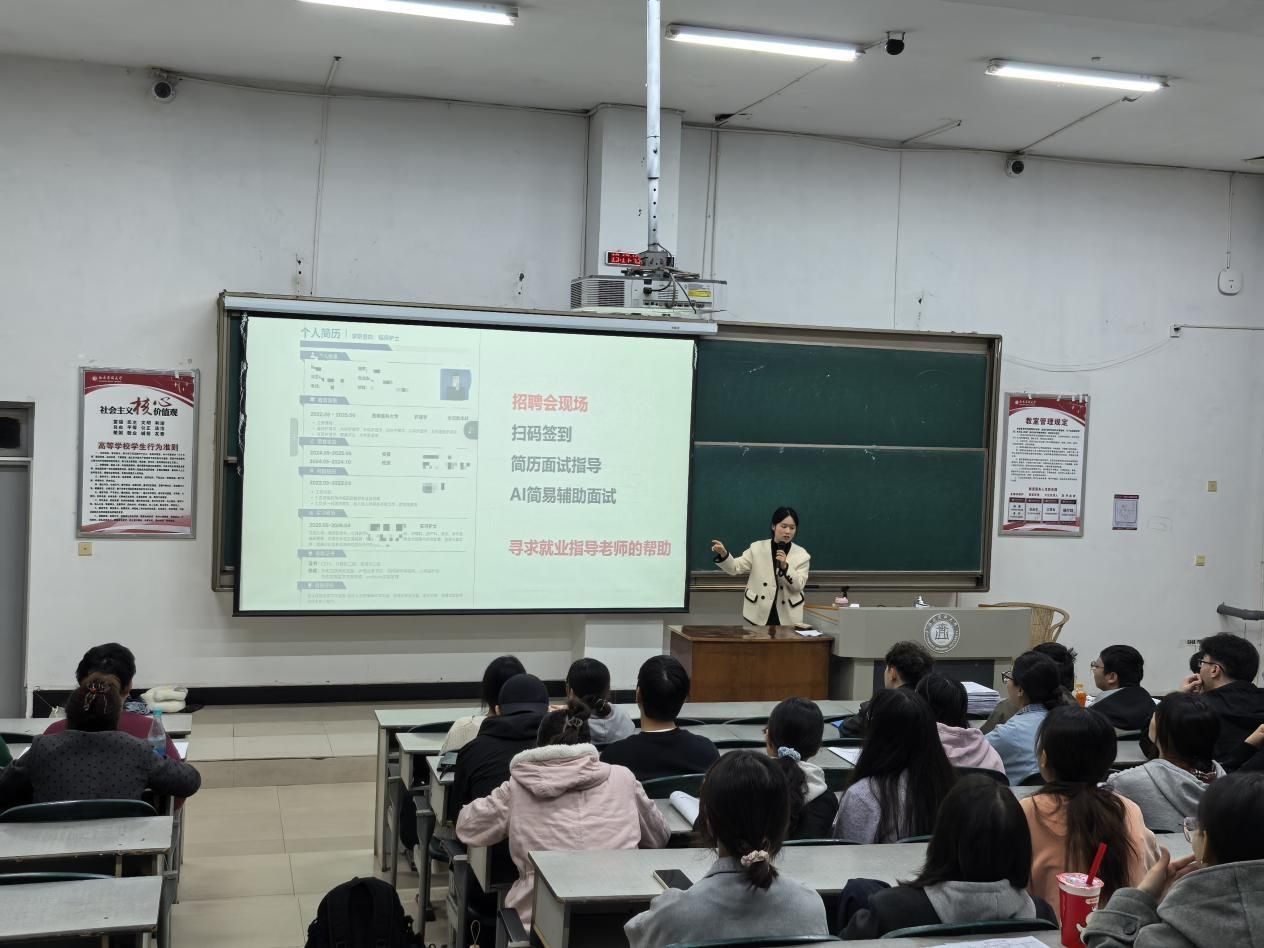 山李围绕“就业与考研”进行指导。她首先强调积极就业的重要性,详细解读简历制作的规范要求与规避要点,同时鼓励同学们主动投递简历,充分利用现场招聘、简历面试指导、AI模拟面试等求职服务资源。此外,她还分享了四川、重庆等地多家医院及医疗企业的最新招聘信息,并建议同学们主动对接就业指导老师,获取个性化求职帮扶。考研指导环节,山李提出“四心”要求——静心、耐心、细心、信心,引导同学们科学调整心态、合理规划时间,高效应对考研与就业的潜在冲突。