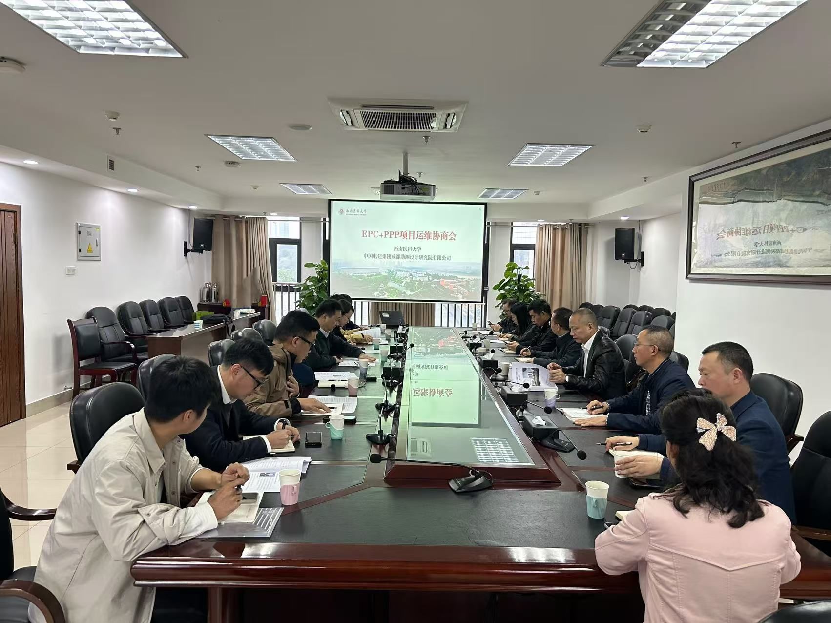 11月7日,中国电建集团成都勘测设计研究院有限公司(以下简称中电建成都院)总会计师宁杰一行来校回访泸州市医教园区基础设施EPC+PPP项目运维情况,学校党委常委、副校长周翔宇接待并主持召开交流座谈会,我校党政办、财务管理处、审计处、国有资产管理处、基建后勤处、资产经营公司等相关职能部门负责人参会,双方围绕运维管理、项目档案资料移交、质保问题整改、使用者付费等问题展开友好深入的沟通。