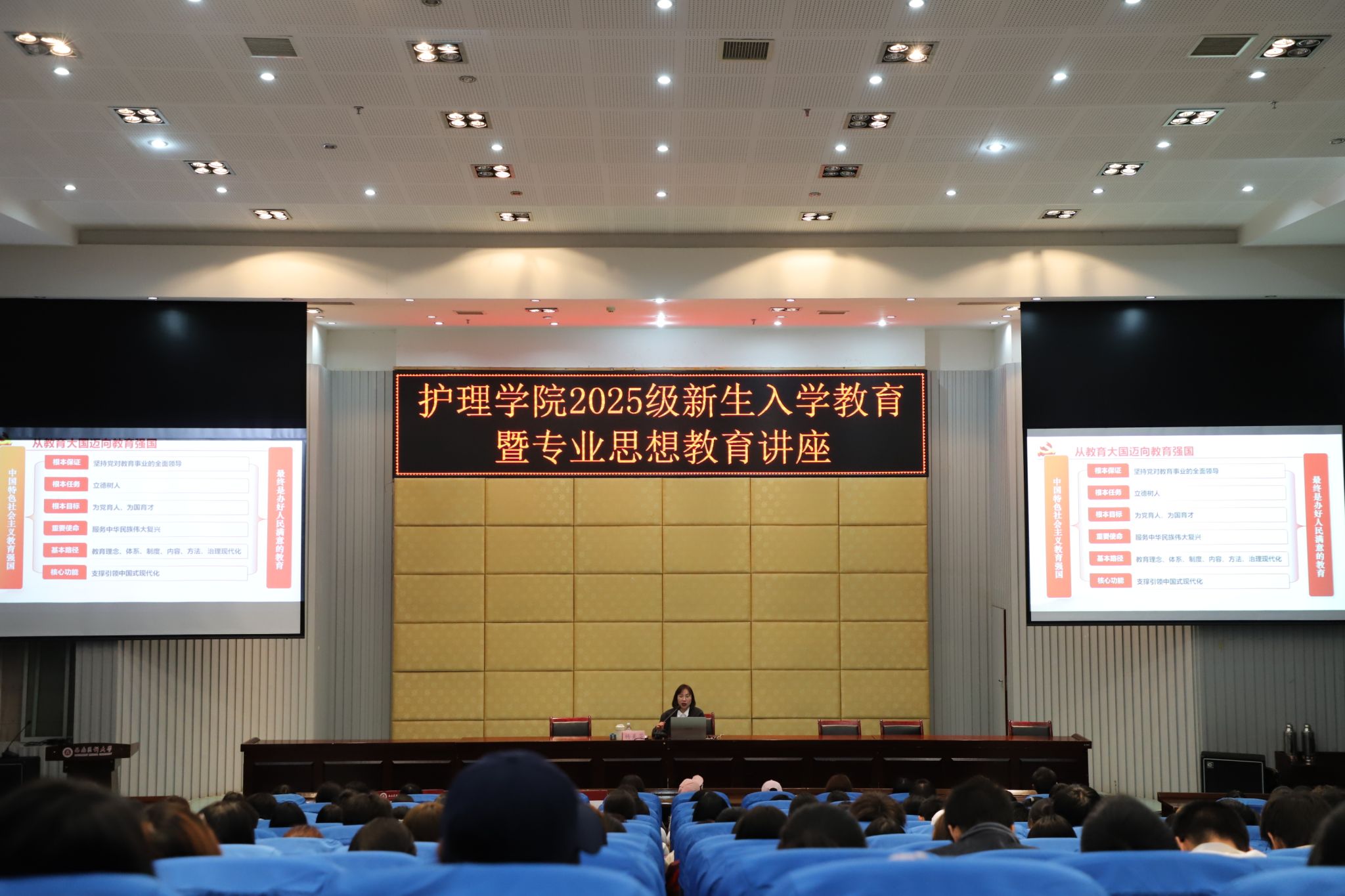 11月10日,护理学院在城北校区第二学术报告厅举行第二场新生入学教育暨专业思想教育讲座,本次讲座邀请护理学院人文护理教研室主任杨美芳主讲,学生科辅导员及2025级全体新生共计300余人参加。讲座由护理学院2025级辅导员张瑞主持。