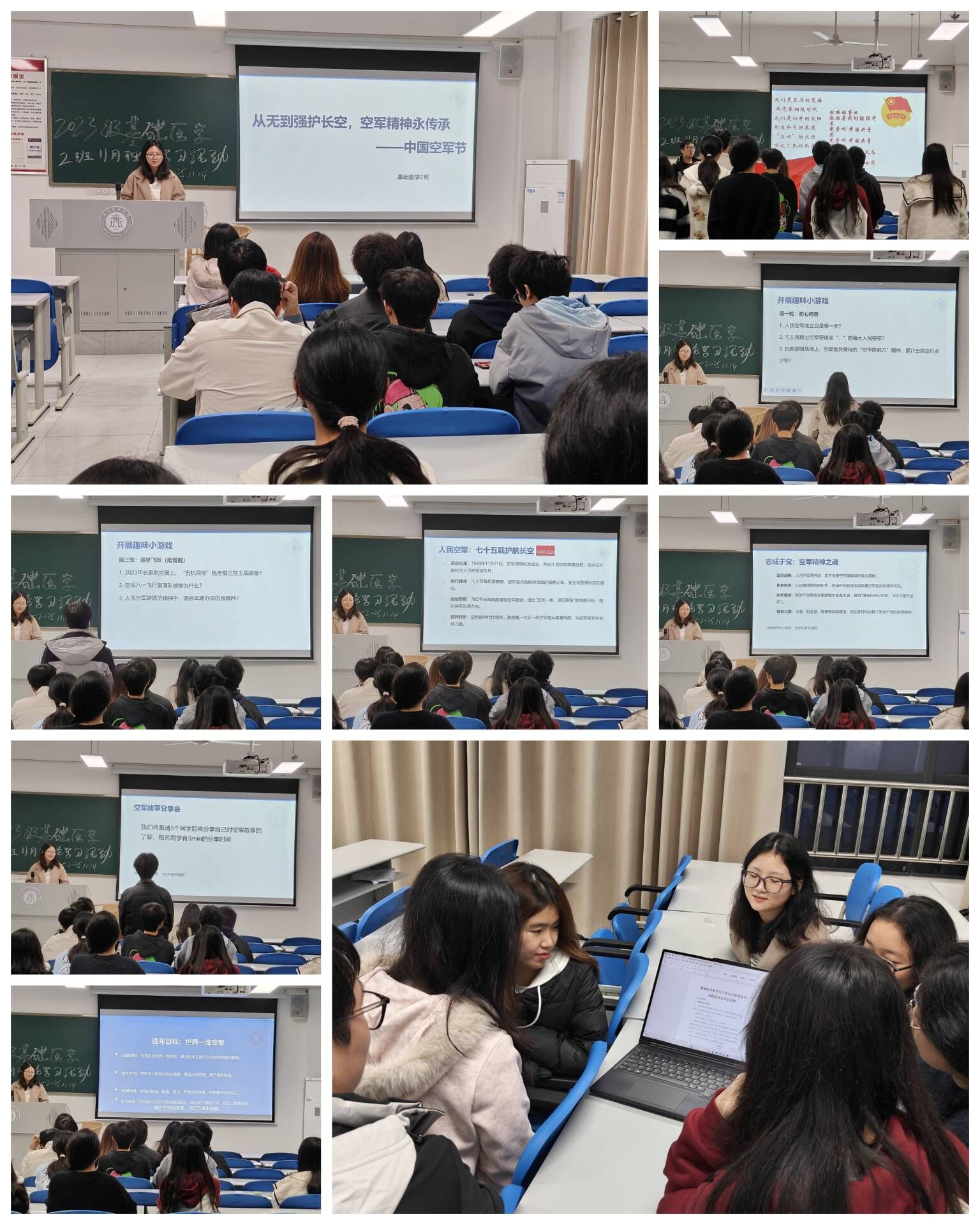 为厚植青年学子家国情怀,传承人民空军忠诚无畏的精神。近日,基础办在文渊楼608教室开展以“致敬人民空军,共筑强军梦想”为主题的11月团课。本次参与课堂的同学:2023级基础医学2班、基础办全体团支书。同学们齐聚一堂,通过唱团歌、趣味问答、主题学习、交流分享等丰富形式,沉浸式感受人民空军七十五载的辉煌征程。
