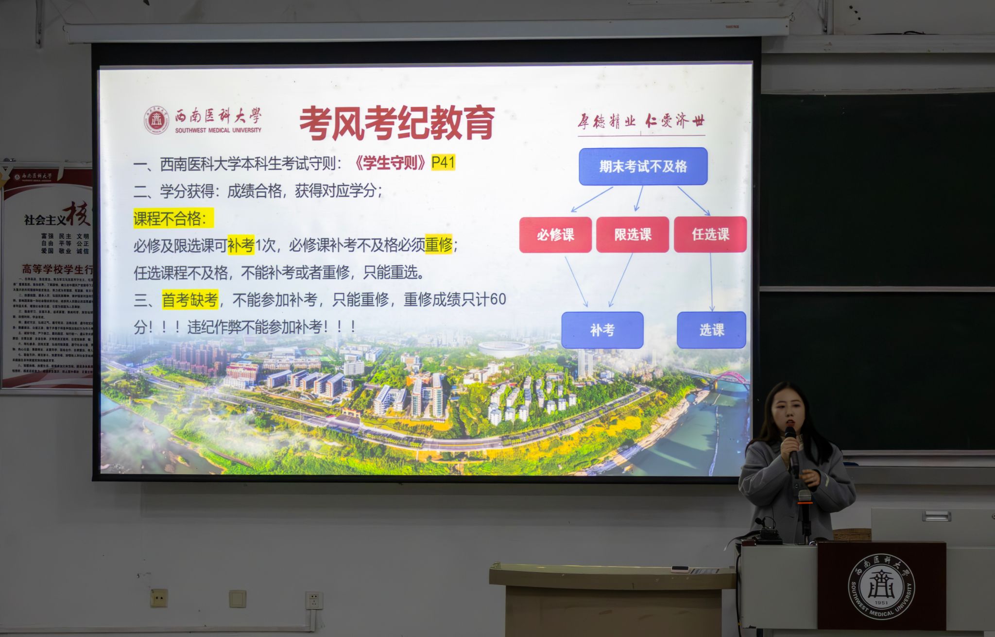最后,杨老师围绕考风考纪展开重点宣讲,强调“诚信比分数更重要”的核心原则,要求同学们严守考试纪律、杜绝违纪作弊行为。她详细解读了违纪作弊的相关处分规定,鼓励同学们树立正确的学业观,合理规划复习时间,积极备考、从容应考,以真实的成绩检验自身的学习成果,以诚信的态度展现体育学子的良好风貌。