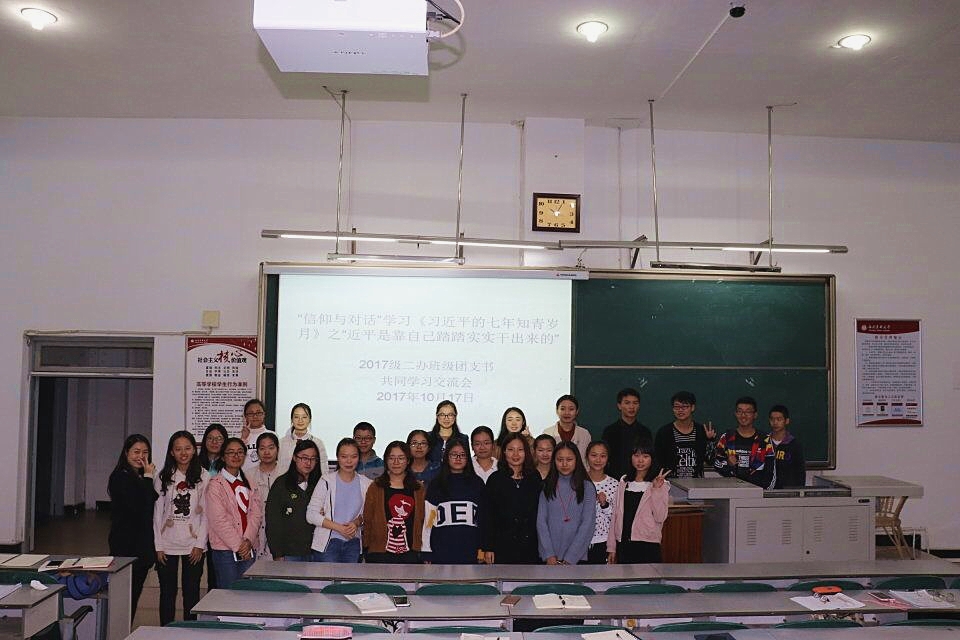 10月17日晚荟文楼205,2017级二办的何顺姣老师、万子怡(团副)、熊高(团副)、组织部所有同学与各班团支书,一起学习了《习近平的七年知青岁月》节选内容“近平是靠自己踏踏实实干出来的”。交流会期间,各同学纷纷发表自己的学习感悟。最后何顺姣老师,总结发言:号召我们的青年学生通过多种多样的形式,向习近平总书记学习,“坚定信念,实干兴邦”。