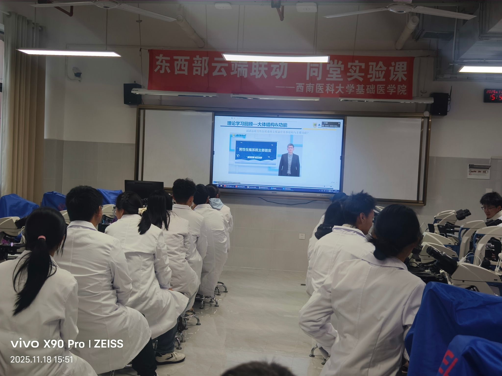 11月18日,由高等学校国家级实验教学示范中心联席会、高等医药院校实验教学中心信息化建设联盟、虚拟仿真实验教学创新联盟基础医学专业工作委员会联合主办,南京医科大学承办的“东西部高校云端联动,同堂实验课(第六期)”正式开讲。本次活动以“男性生殖系统切片观察及精子发生虚拟仿真实验”为主题,通过线上线下相结合的方式,实现了九所东西部高校的同步教学与深度互动。我校作为重要参与院校之一,在思源楼形态学322互动实验室设置同步课堂,基础医学院院长谭晓秋、党委书记阳静、分管教学副院长曾永秋,以及教务科、教研室教师代表与2025级基础医学专业“祖德班”全体学生共同参与此次云端教学盛宴。