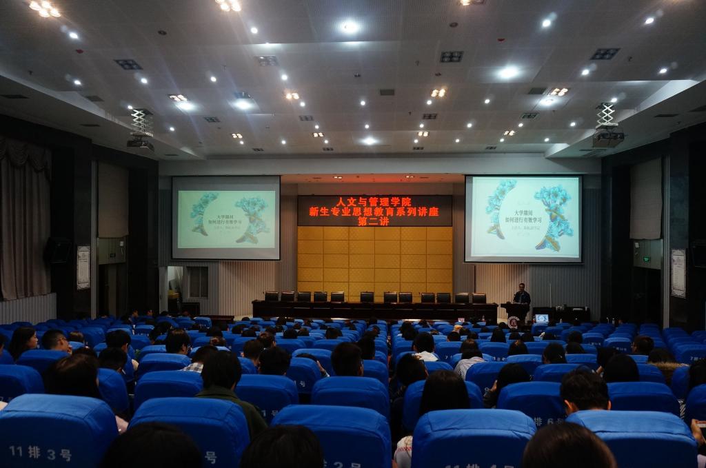 10月25日晚,为营造良好学风,指导学生尽快适应大学学习,人文与管理学院举行新生专业思想教育系列讲座之学风建设主题讲座,此次讲座由学院党总支副书记陈屹在城北校区学术报告厅主讲。人文与管理学院2017级全体同学聆听了讲座。
