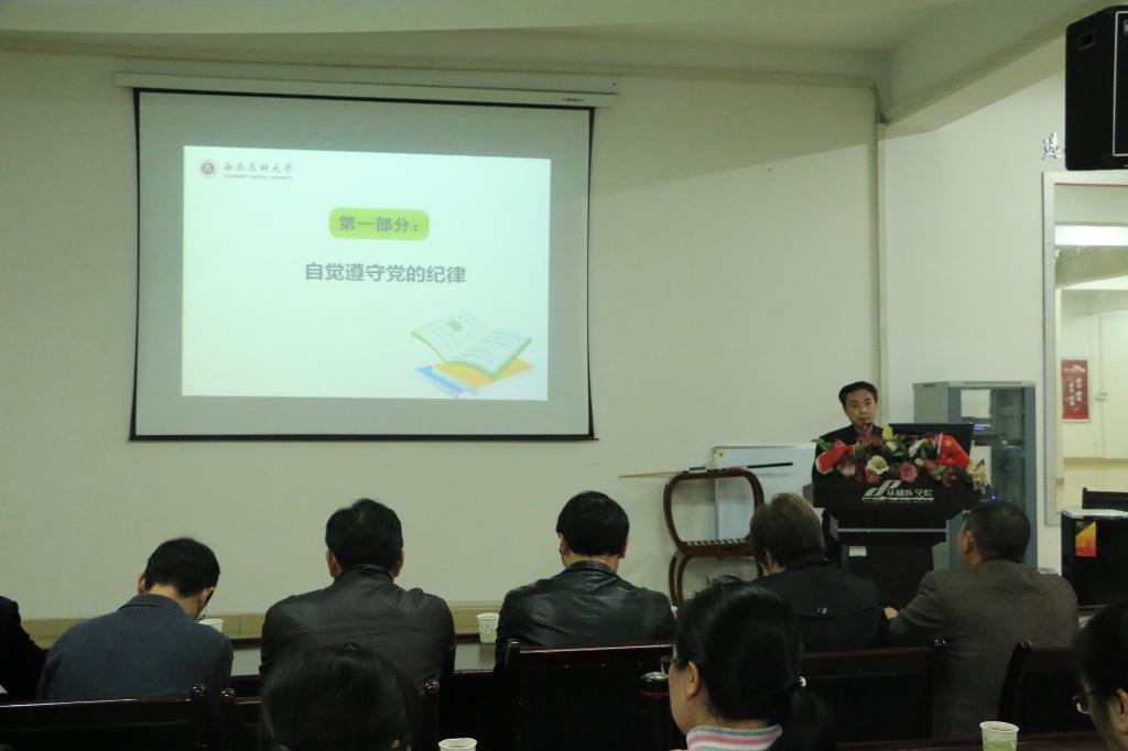 刘广益副从自觉遵守党的纪律、监督执纪的“四种形态”、问题思考三个大方面,结合许多现实案例详细讲解了党中央的“八项规定”、两个《准则》、三个《条例》和100条禁令,明确提出了坚定理想信念宗旨、加强党性修养、严守党的纪律、改进工作作风、坚持道德底线、筑牢廉洁自律防线、严格党内监督、严肃党内政治生活、尊崇党章、严管“关键少数”等十大要求。此次讲座是一场集理论性、法规性、实践性、指导性于一体的专题报告,让基础医学院师生受到了一次很好的党规党纪教育。张依国强调,希望大家在今后的工作中把牢政治方向上走在前面,起好表率;在严格遵守党章党规上走在前面,起好表率;在转变作风、干事创业上走在前面,起好表率。