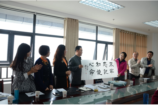 刘毅副书记代表马克思主义学院向皇甫老师赠送纪念相册,皇甫老师也以一副“不忘初心、牢记使命”书法作品回赠马院为纪念。
