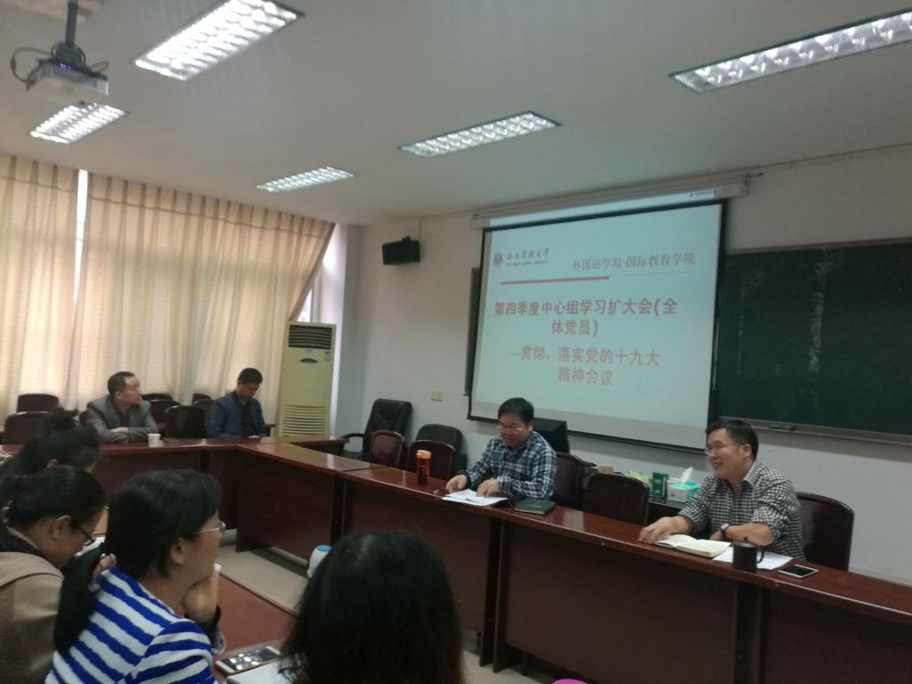 11月9日下午,外国语学院·国际教育学院召开第四季度中心组学习扩大会议,深入学习贯彻党的十九大精神。党总支书记李昌平主持会议,学院全体教师党员参加了会议。李昌平首先对十九大党章修改内容进行了专题讲座并对十九大的六个“新”进行了解读。党总支副书记田耘对新时代中国特色社会主义的政治宣言和行动纲领结合自身工作实际进行了解读并畅谈了学习体会。其他几位总支委员对十九大的关键词、新提法新举措四十个进行了解读。