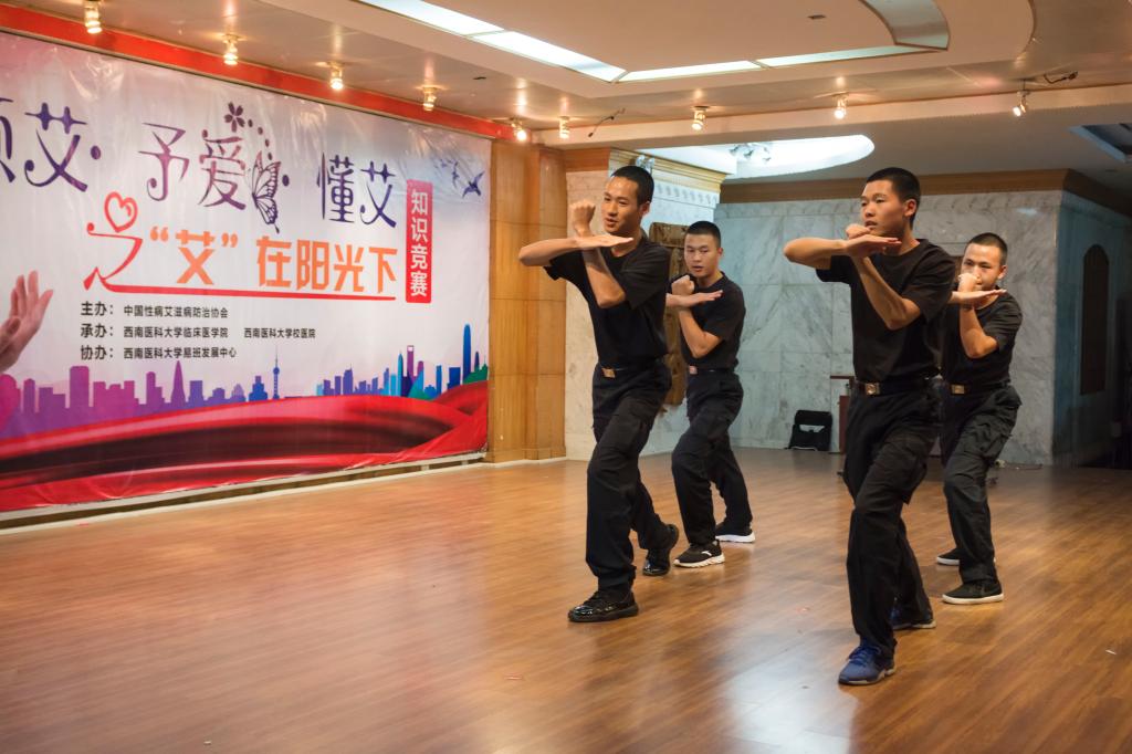 下午三时,大赛正式开始。大赛分为 “敢‘艾’你就来”、 “艾”拼才会赢、“艾”之车轮战、为“艾”站到底、“‘艾’我怕了吗?”等五个环节。在比赛中,参赛高校纷纷带来了 “擒敌拳”、手语操——《和你一样》《春江花月夜》街舞等表演活力四射,引得台下喝彩连连。10秒抢答题环节,各参赛队积极答题,表现精彩。最后一个环节中,需要在一分钟内吹安全套并在上面写出防艾宣传标语,按照完成个数计分。为了在最后一个环节为自己加分,各个代表队使出浑身解数,团队分工明确,协作默契,现场亲友团及观众加油助威,气氛异常高涨。