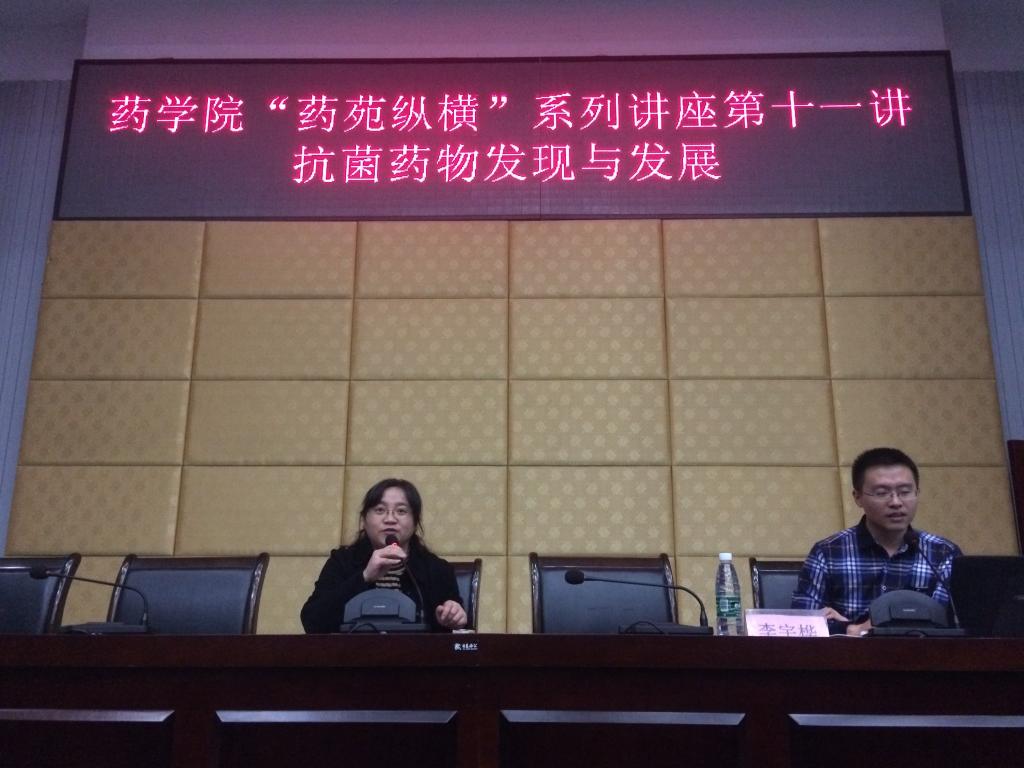 近日,药学院学生科邀请了中国人民解放军四二二医院副主任药师李宇桦博士在城北校区学术报告厅作了题为《抗菌药物的发现与发展》的专题讲座。本次讲座旨在面向大一和大二的同学介绍抗菌药物的发现过程和发展方向,普及药学知识,增强同学们的专业自信。药学院党委书记李祥、药学院全体辅导员、2016级和2017级各班同学共计300余人参加了讲座。药学院党委副书记兼纪委书记王宏丽主持讲座。