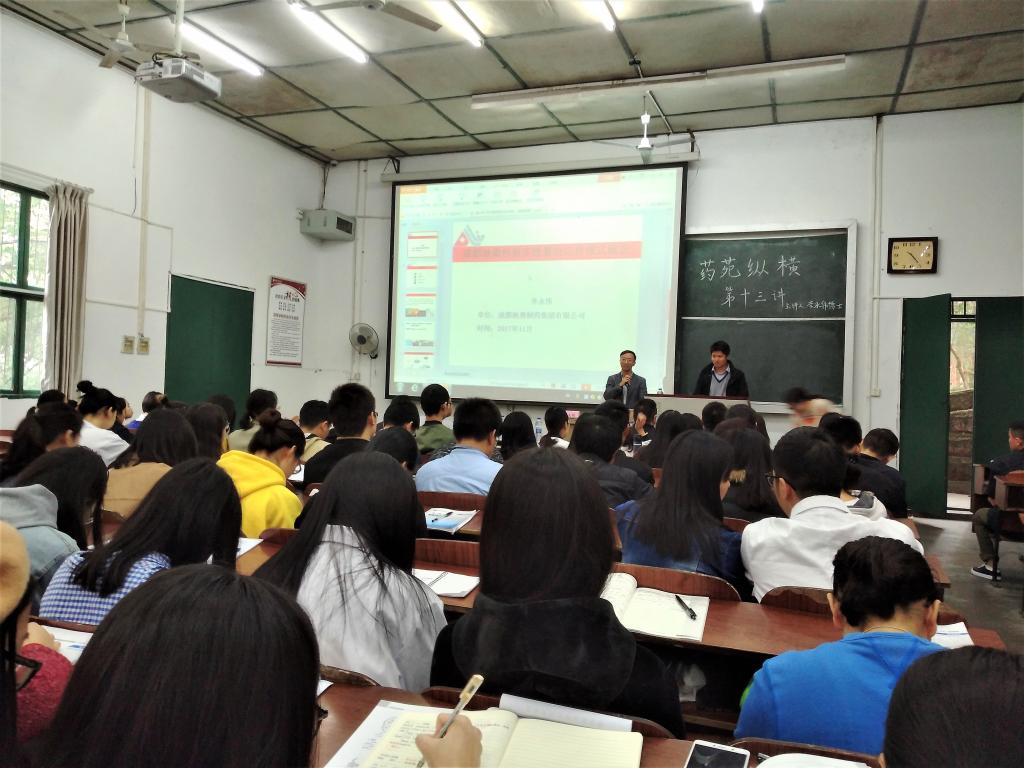 为了让学生较为系统地了解新药研发过程,增强科研意识,明确学习目标和就业方向,11月15日,药学院邀请成都地奥集团中药、天然药物研发总监李永伟博士在忠山校区31阶教室举办了题为《基于“谱-构-效-毒”关系对新药MDZGC的研究》的讲座。药学院党委副书记兼纪委书记王宏丽、学生科辅导员周全及药学院三个专业2018届毕业生参加了讲座。讲座由药学院党委书记李祥主持。地奥集团销售部相关领导参加了讲座并与学生进行了交流。