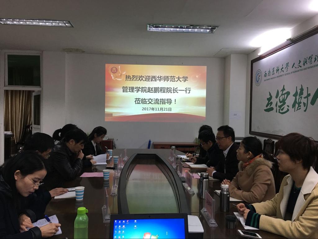 11月21日上午,西华师范大学管理学院赵鹏程院长带队到我校人文与管理学院就社保专业(以下简称"社保专业")建设相关工作进行交流座谈。学院院长赵成文、副院长谷满意、社保教研室教师代表等参加了座谈会。