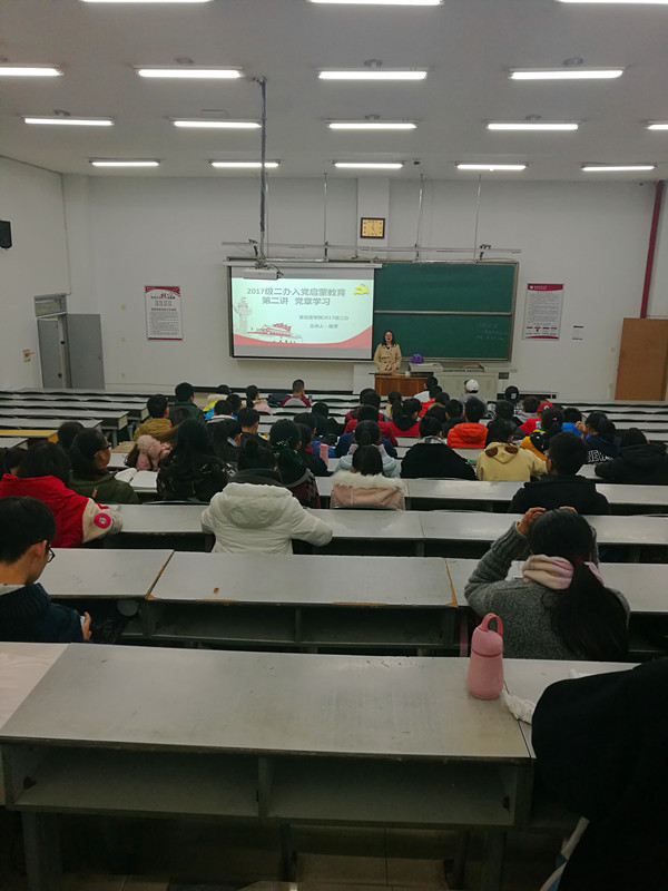 11月22日基础医学院2017级二办在荟文楼202教室开展了以“喜迎十九大,学习新党章”为主题的入党启蒙教育第二讲,主讲人为2017级二办年级副主任侯萍,约100名学生参加了本次讲座。