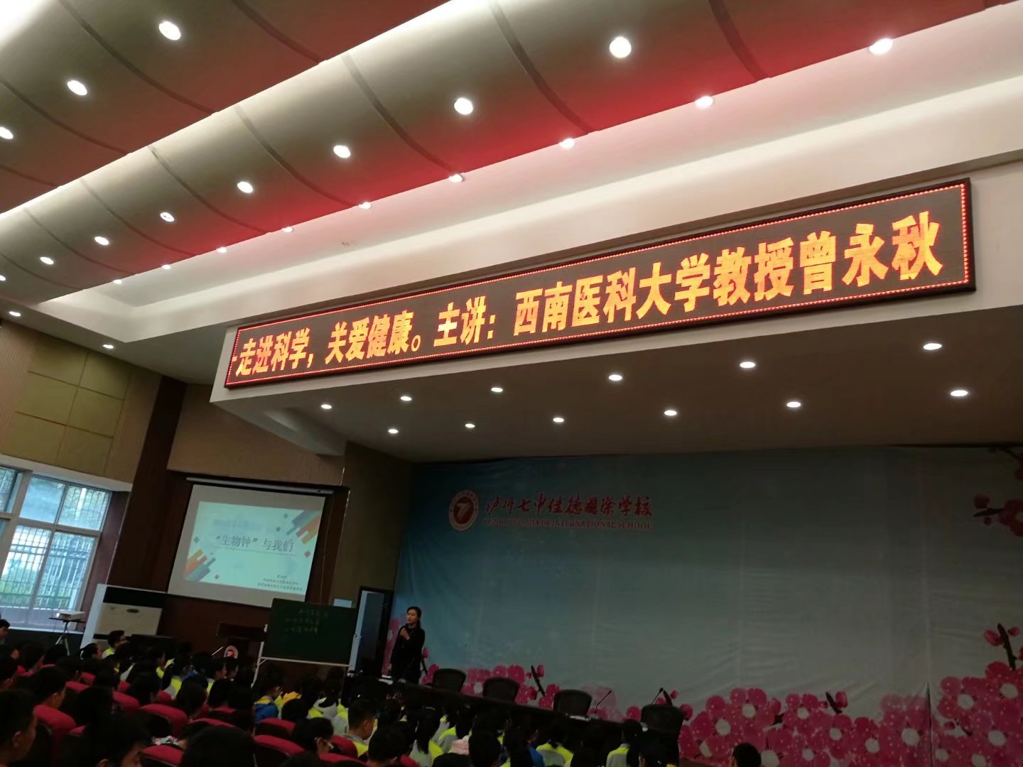11月19日,基础医学院医学细胞生物学与遗传学教研室副主任曾永秋博士在泸州市七中佳德国际学校学术厅作了《生物钟与我们——2017年诺贝尔生理学和医学奖解读》为题的科普讲座, 500余名师生参加了此次活动,泸州电视台对活动进行了跟踪报道。