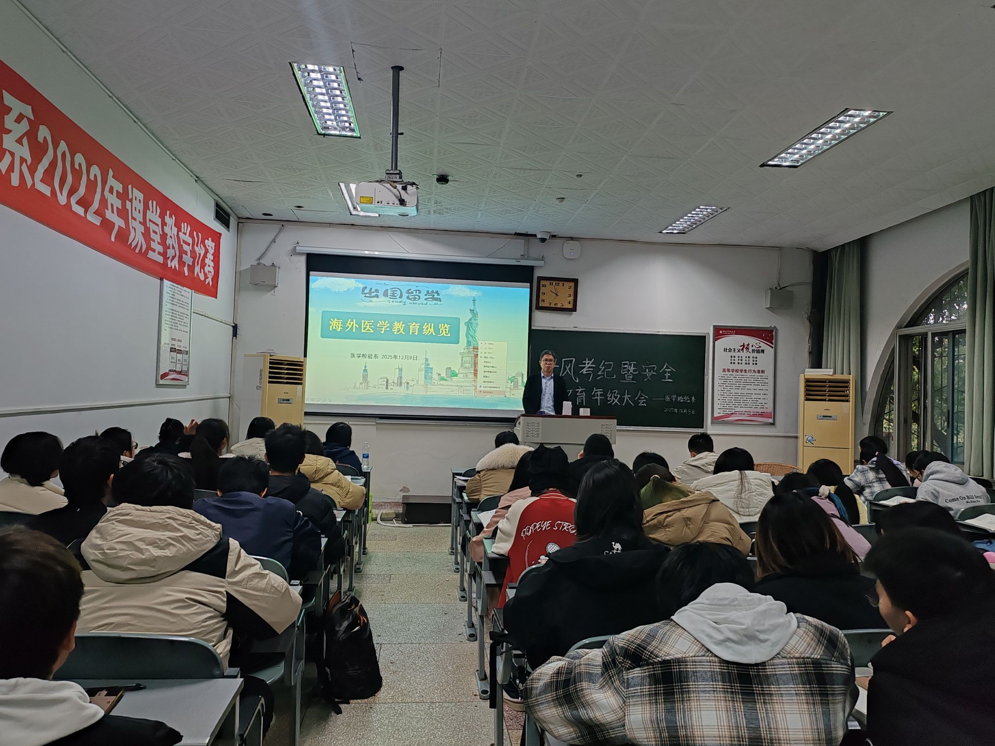 为拓展学生多元成长路径,12月9日上午,医学检验系在忠山校区图书馆502教室举办留学宣讲会,会议由学生科科长李尚学主讲,医学检验技术专业2023级全体学生和部分实习学生参加。