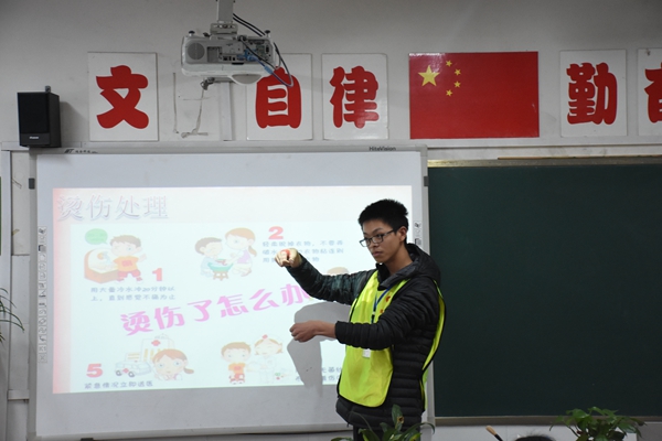 下午两点,青年志愿者们到达泸州市第十八中学,与小学部五年级1班的小朋友们在操场上开展了“乒乓运输”、“球球大作战”等游戏。游戏结束后,大家又一同来到教室,进行医学知识普及活动。通过PPT的展示、志愿者讲解、小品表演等,志愿者们教会了小朋友们如何应对烫伤、割伤、触电、流鼻血等紧急情况以及日常生活中感冒、冻疮等常见小病的预防和处理方法。活动不仅扩充了小朋友们的医学知识,提高了他们紧急情况下的自救能力,同时也增强了志愿者同学的社会责任感和沟通交流能力。