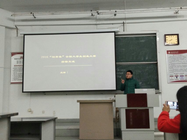 三位同学围绕“以我之路为你点灯”的主题,从不同角度,以自己多年的参赛经验,和同学做了创新创业分享。庄杨分享了“创青春”全国大学生创业大赛的参赛流程、参赛项目方向的选择及商业计划书的撰写等;杜沛沛分享了“挑战杯”大赛的参赛流程及参赛注意事项等,她告诉同学灵感来源于生活,我们应多观察生活,从生活中获取灵感;范西向同学分享了她创新创业大赛的三个心得,胆子要大、心思要细、路子要野。
