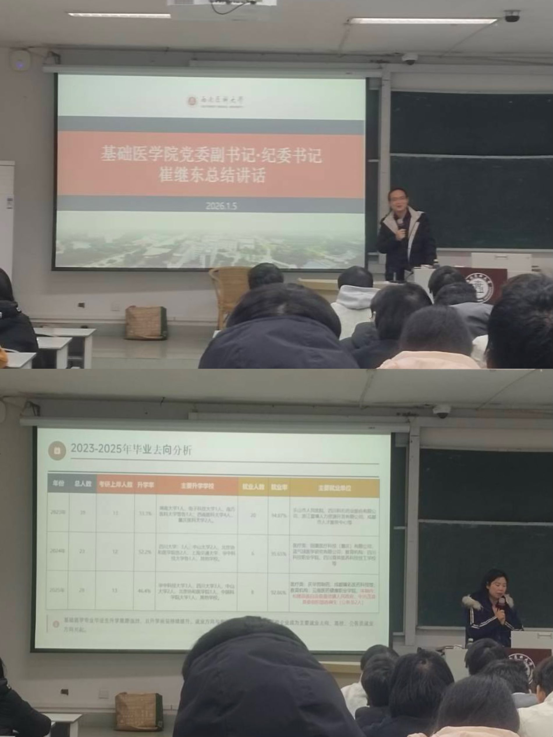 为引导学生明确发展方向、增强升学信心,科学规划未来发展路径,1月5日,基础医学院在鸿文楼201组织召开了考研动员暨毕业去向分析大会。基础医学院党委副书记·纪委书记崔继东出席会议并作总结讲话,基础医学办主任王旭利主持会议。2022级基础医学专业53名学生及辅导员田艳参加会议。