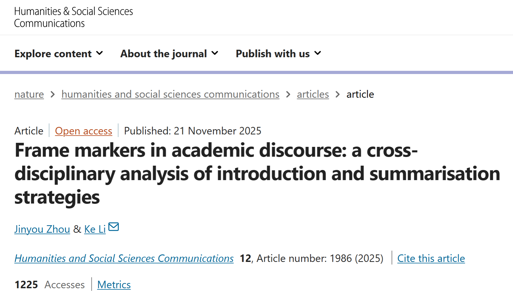 近期,外国语学院周今由博士团队在国际权威学术期刊Nature子刊Humanities and Social Sciences Communications(中科院2区,影响因子3.6)发表题为“Frame markers in academic discourse: A cross-disciplinary analysis of introduction and summarisation strategies”的研究论文。