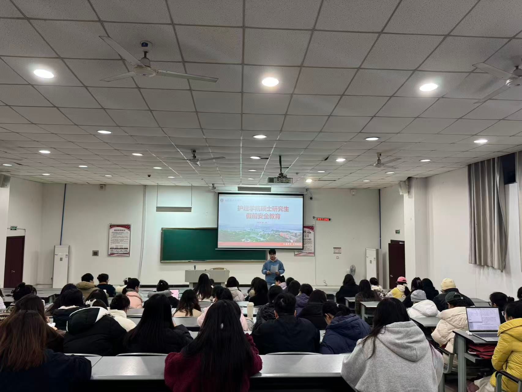 1月15日,护理学院在城北校区海川楼314教室组织召开研究生假前安全教育大会,全面传达并部署落实学校2026年第一次研究生安全工作会议精神。院长陈燕华、学科建设与研究生管理科副科长曾静媛和周志扬老师出席会议,2023级至2025级在校护理研究生参加会议。会议由曾静媛主持。