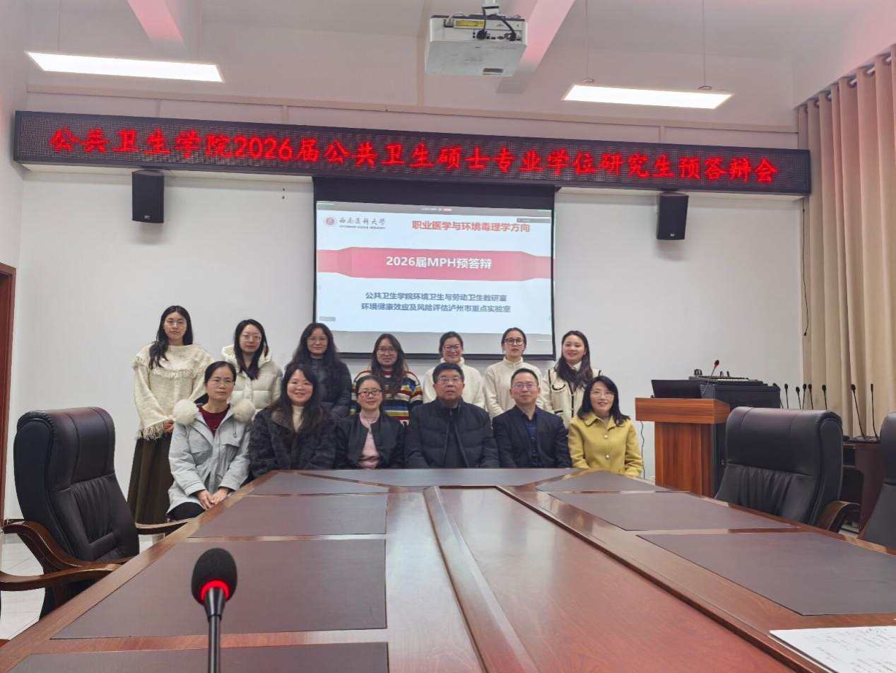 1月27日,公共卫生学院组织开展职业医学与环境毒理方向2026届公共卫生硕士毕业预答辩。本次预答辩邀请到南京医科大学中毒研究所副所长/博士生导师刘起展教授、重庆医科大学公共卫生学院副院长/博士生导师陈承志教授,以及四川泸州生态环境监测中心站副站长/正高级工程师扈正权担任评审专家。会议由环境卫生与劳动卫生教研室主任、环境健康效应及风险评估泸州市重点实验室主任张青碧教授主持,教研室全体教师及全体在读研究生参加。