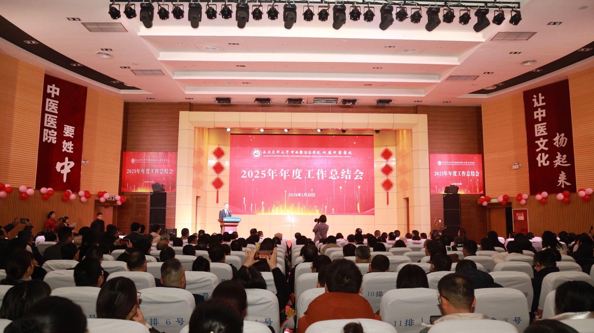 1月30日,中西医结合学院·附属中医医院召开2025年年度工作总结会。西南医科大学党委书记张春祥、校长何涛,副校长江涌,医院院领导班子,党总支书记,老领导、老专家,科级干部,临床及辅检科室主任、护士长、教研室主任及党支部书记等参加了会议。会议由医院党委书记代天祥主持。