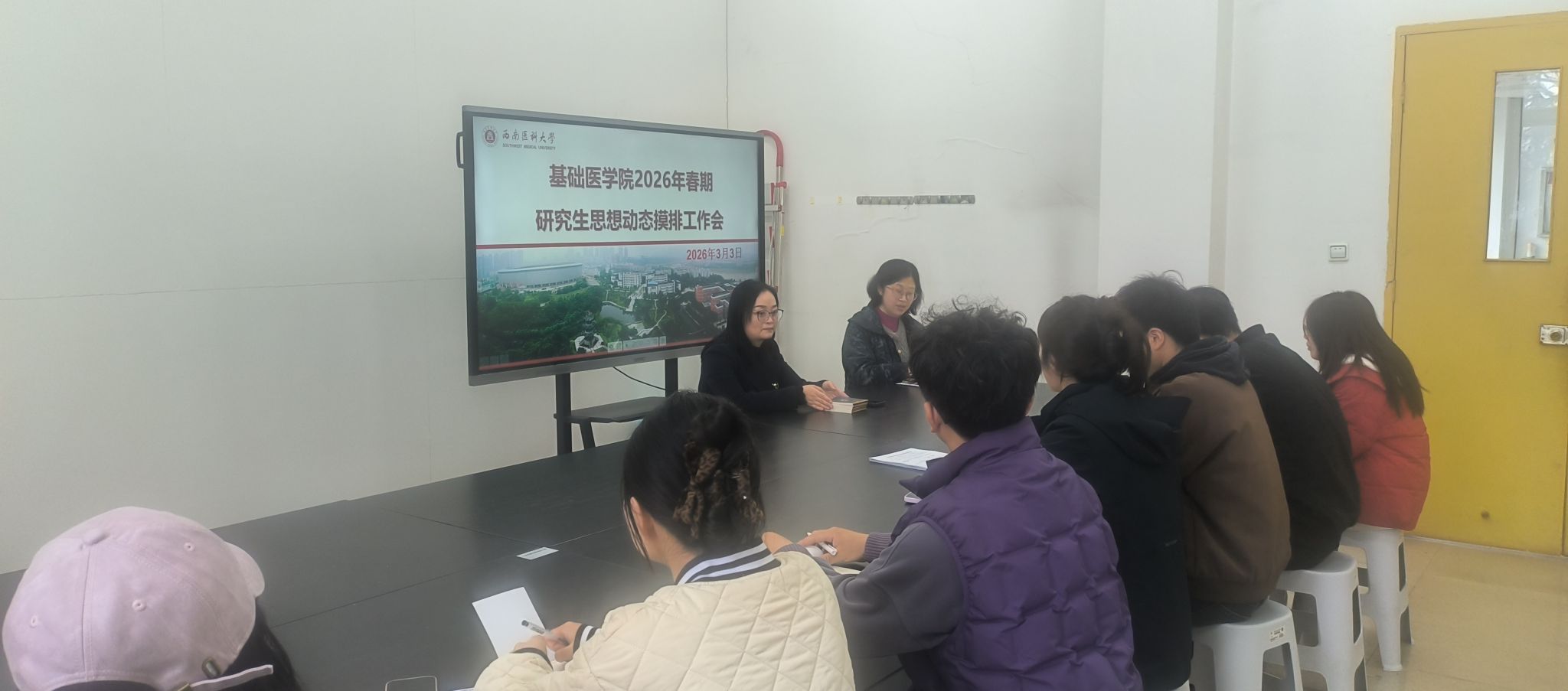 为精准掌握师生思想动态,扎实开展思想政治工作,切实做好研究生的日常管理与服务工作,3月3日,基础医学院在鸿文楼4-9会议室召开研究生新学期思想动态摸排专题座谈会。会议由学院学科建设与研究生管理科科长王译伟主持,研究生辅导员刘源及各年级班干部及研究生代表参会。