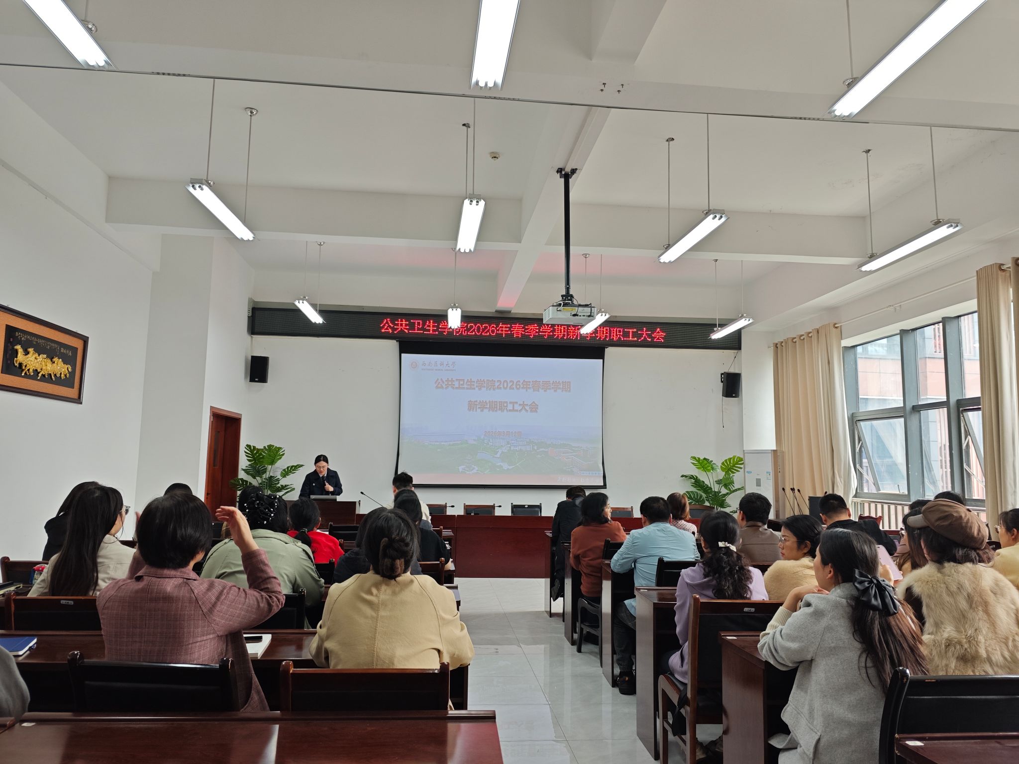 为统筹推进学院年度重点任务,切实保障新学期各项工作有序开展,全面落实新学期各项工作,3月12日下午,公共卫生学院在仁济楼319会议室召开新学期职工大会。会议由学院党委书记马玲主持,全体教职工参加。