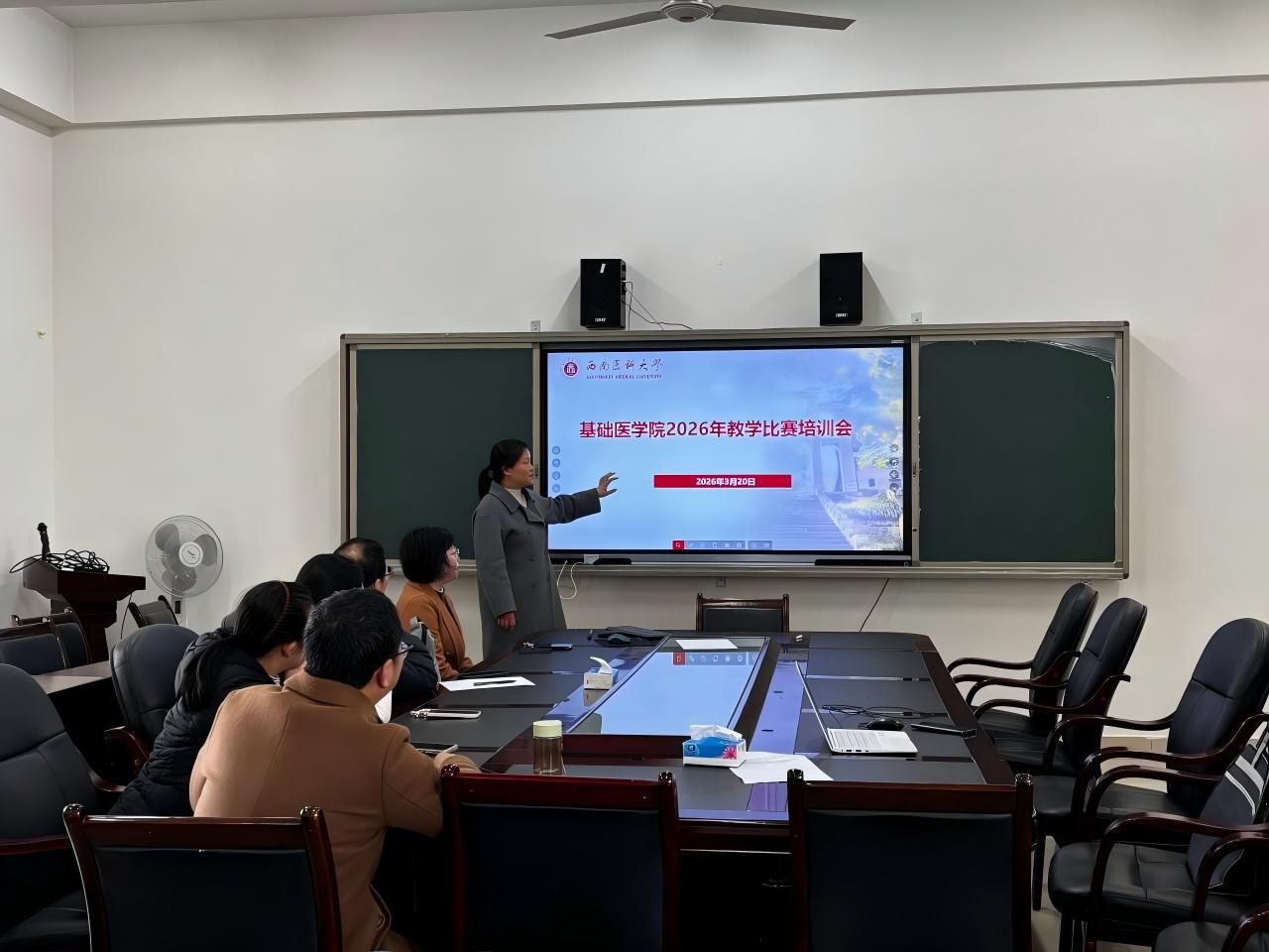 3月20日上午,基础医学院在鸿文楼4-1教室举办2026年教学比赛培训会。今年拟参加“泸州老窖‘金教鞭’奖”及“金教鞭之星”奖评选的全体教师参加培训。