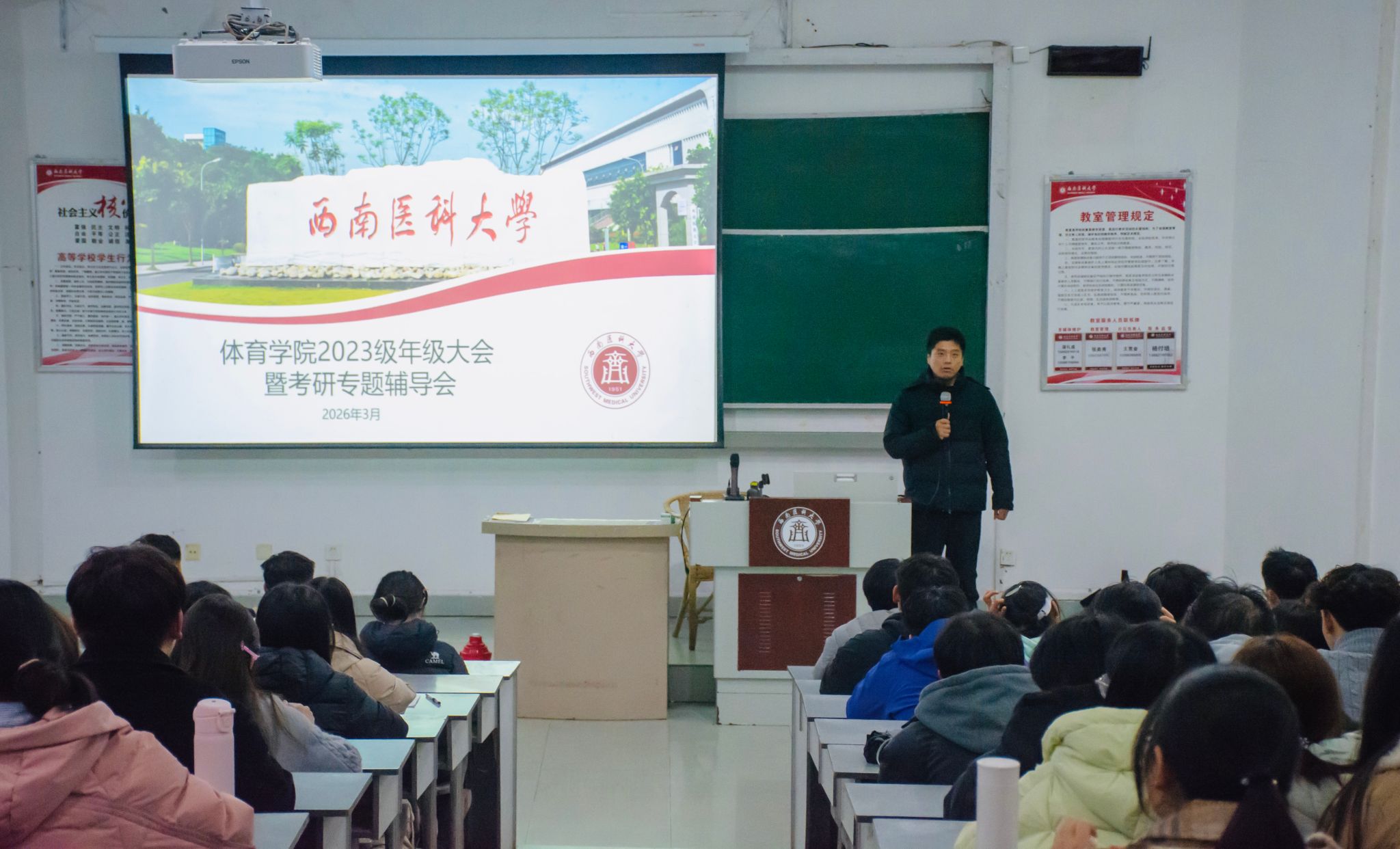 3月19日,体育学院于城北校区鸿文楼召开2023级年级大会暨考研辅导会,体育学院副院长刘中强、学生科科长李斌、辅导员李浩参加会议,会议由李斌主持。