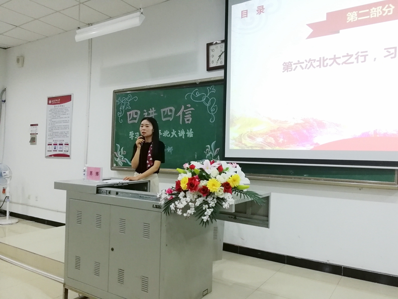 讲座中,苏娜从习近平历年来的重要讲话中对青年的寄语开始,向在场的学生干部讲述了何为“青春”,鼓励青年学生要在奋斗中创造自己的幸福,实现自己的人生价值。在谈到,青年应当如何奋斗时,苏娜组织全体学生干部集体观看了北大学子宋玺的励志视频,激发了同学们的奋斗热情。苏娜还介绍了习总书记本次北大之行对青年学生提出的四点要求:即爱国、励志、求真、力行,并再次鼓励在场的每一位学生干部要“不忘初心,砥砺前行”,不断奋斗,秉时代新风,主动担当起社会主义建设者和接班人的使命。