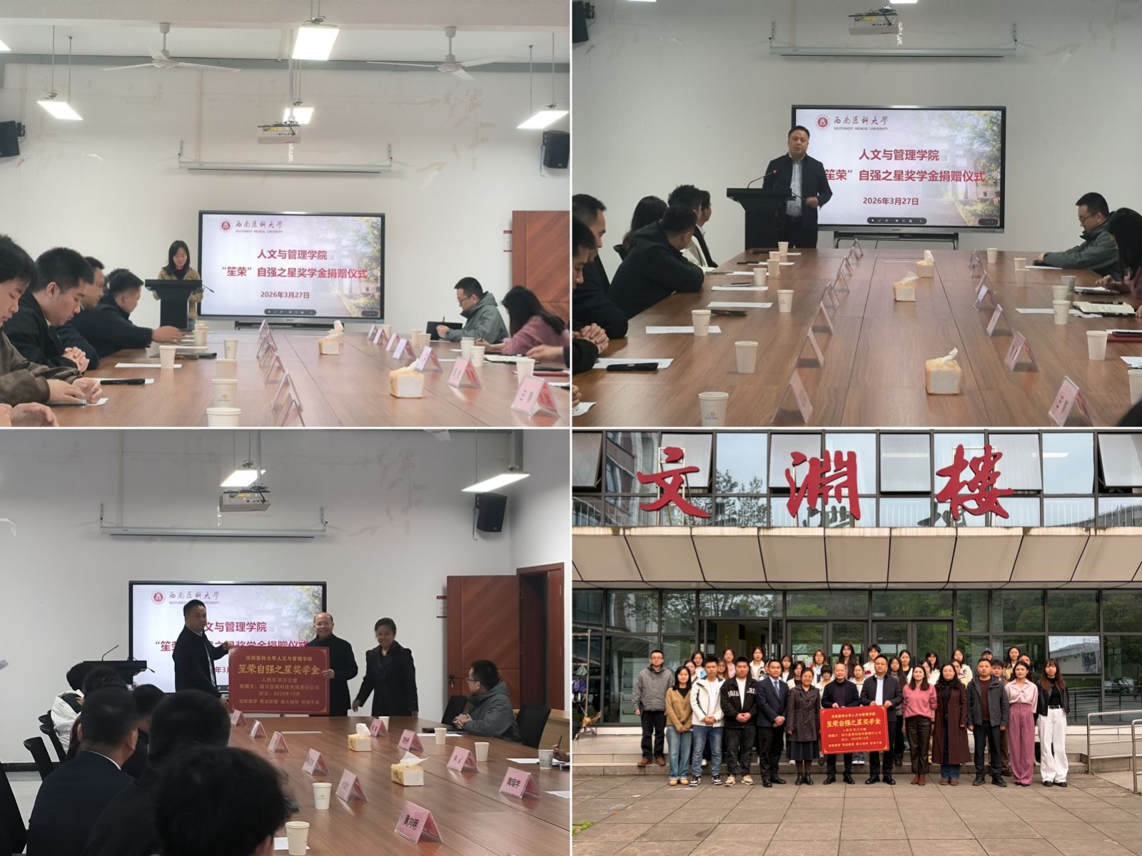 3月27日上午,人文与管理学院“笙荣”自强之星奖学金捐赠仪式在文渊楼233会议室举行。四川笙荣科技有限责任公司总经理、2005级校友徐翼虎一行,西南医科大学教育发展基金会副理事长陶瑞宇,人文与管理学院领导马俊、周佳、李彦,学院辅导员及20名获奖学生代表出席仪式,由学生科科长范丹丹主持。