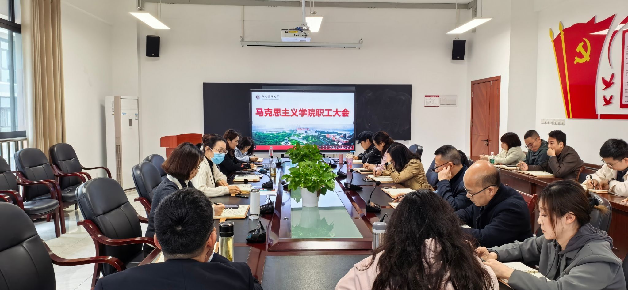 3月30日下午,马克思主义学院在文渊楼432会议室召开全体职工大会,就学院近期重点工作进行再部署、再压实、再强调。会议由学院院长黄晓利主持,学院全体教职工参会。