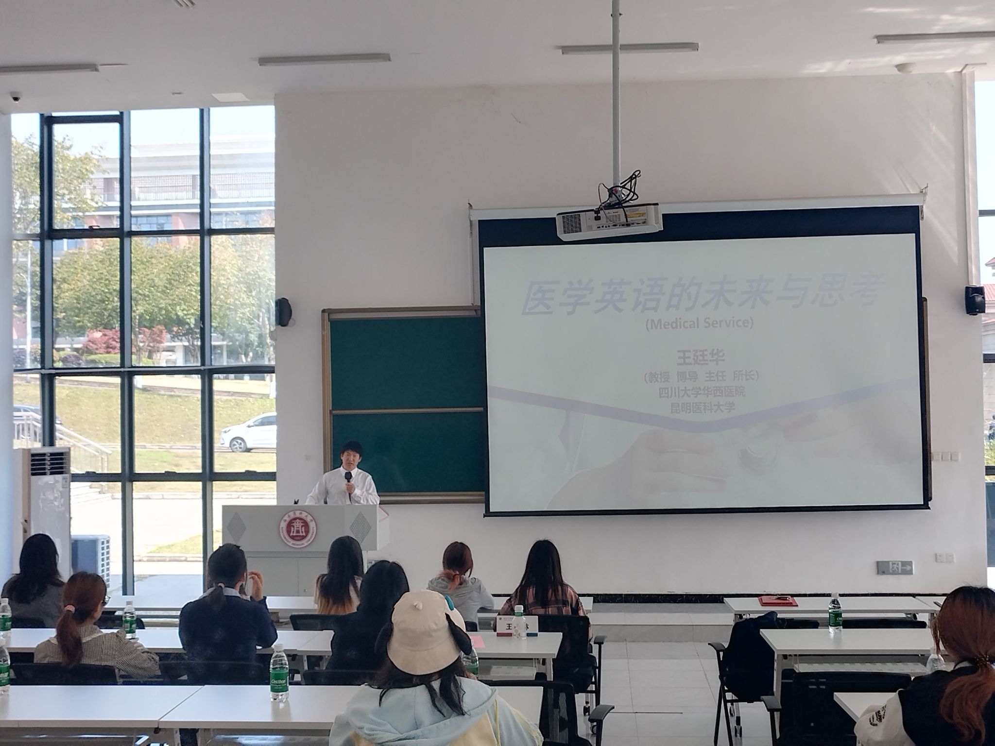 4月9日下午,外国语学院特邀中国解剖学会·临床神经解剖分会主任委员,四川大学华西医院神经疾病研究室主任兼昆明医科大学神经科学研究院院长王廷华教授为学院师生作主题为“医学英语的未来与思考”的专题讲座。讲座由学院党委副书记邓盛木主持,学院各年级学生代表和教师代表参加了此次讲座。