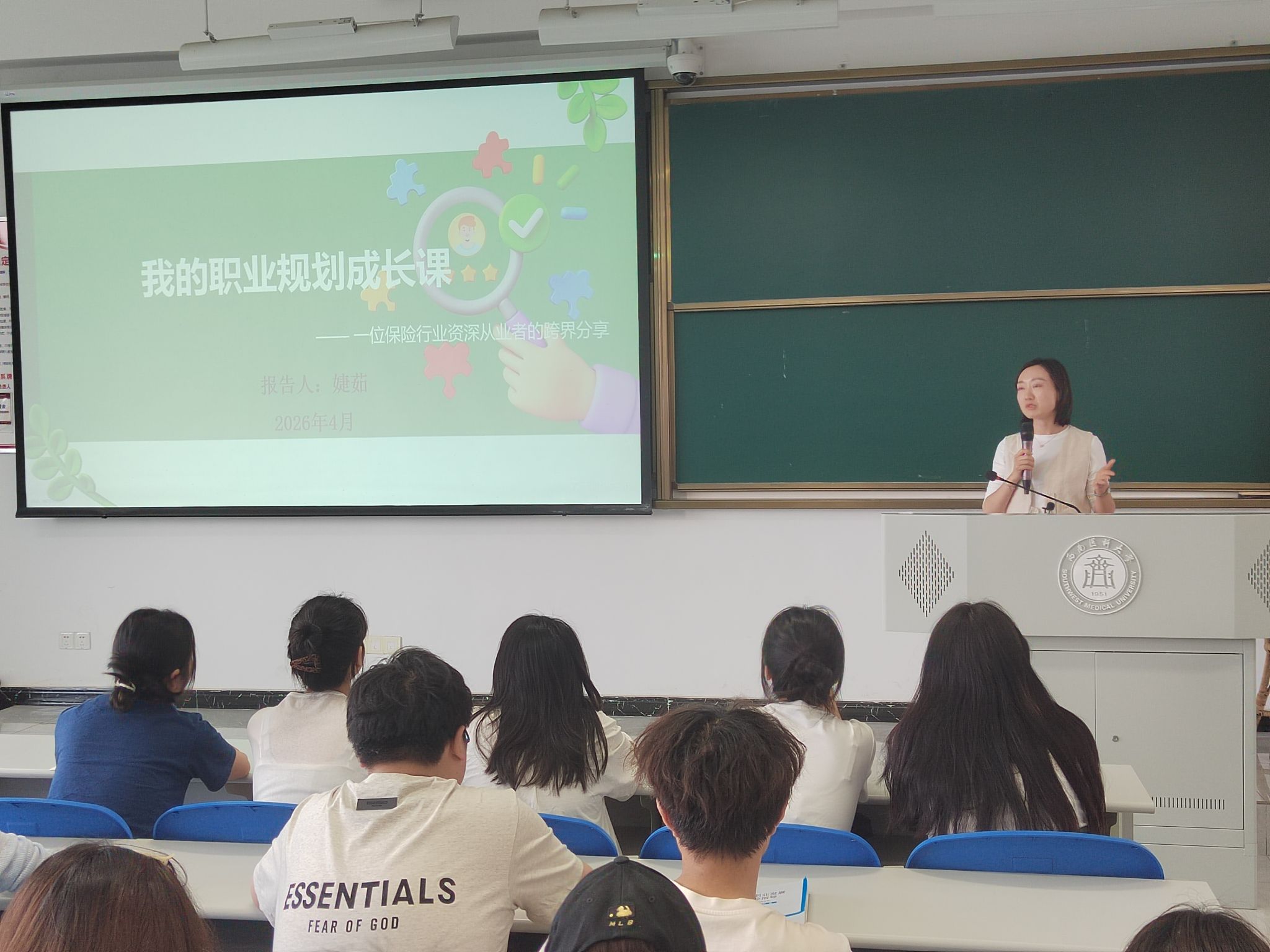 何婕茹结合自身从体制内到白酒行业、再到保险领域的多元跨界经历,围绕“自我认知—职业探索—目标设定—行动调整”四大模块,系统分享了职业规划的核心逻辑与实战方法。她以舒伯工作价值观量表为工具,引导同学们识别核心能力、厘清职业价值观,并鼓励大家在理想工作环境与个人优势的交集中寻找发展方向。