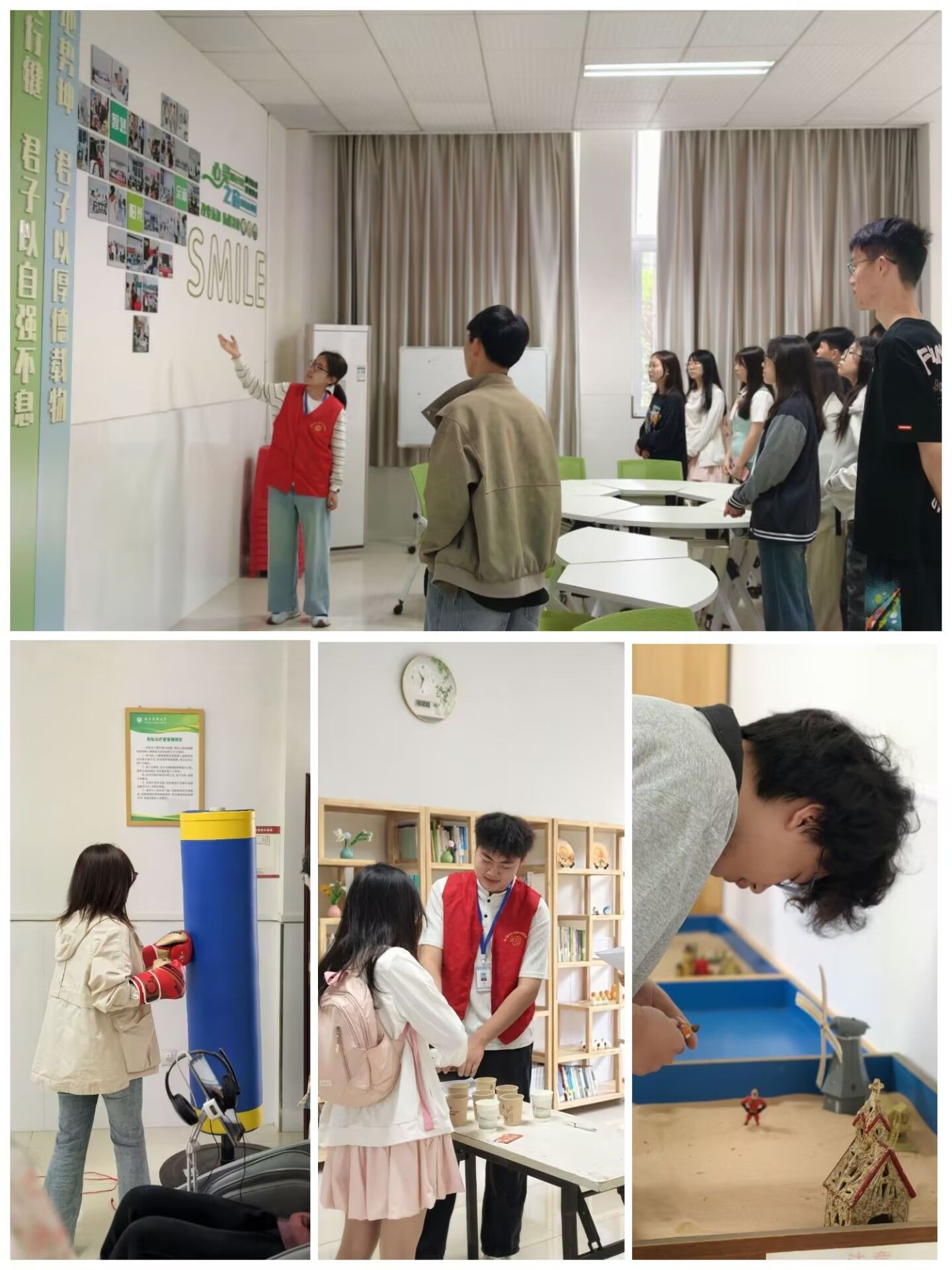 在朋辈心理辅导团成员的引导下,参与学生有序参观了心理咨询室、沙盘治疗室、情绪宣泄室、放松治疗室及团体辅导室等功能区,沉浸式体验专业温馨的心理支持环境。细致的讲解使参与学生全面了解了心理中心的服务内容、专业设备、心理咨询预约流程以及学校心理活动的开展情况,有效消除了他们对心理工作、心理咨询的神秘感与认知误区,真切感受到心理资源触手可及。