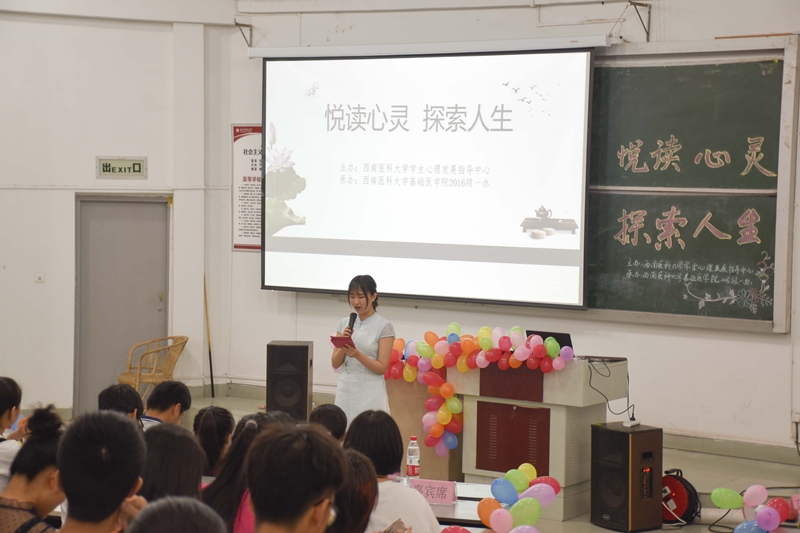 2018年5月18日晚,由西南医科大学学生心理发展指导中心主办,基础医学院2016级一办承办的“5·25”大学生心理健康教育宣传活动月之“悦”读心灵读书分享会在鸿文楼101教室举办。学生工作部副部长杨继宏、学生心理发展指导中心主任李尚学、应用心理学教研室老师冯淑丹以及基础医学院各年办辅导员出席了本次活动。