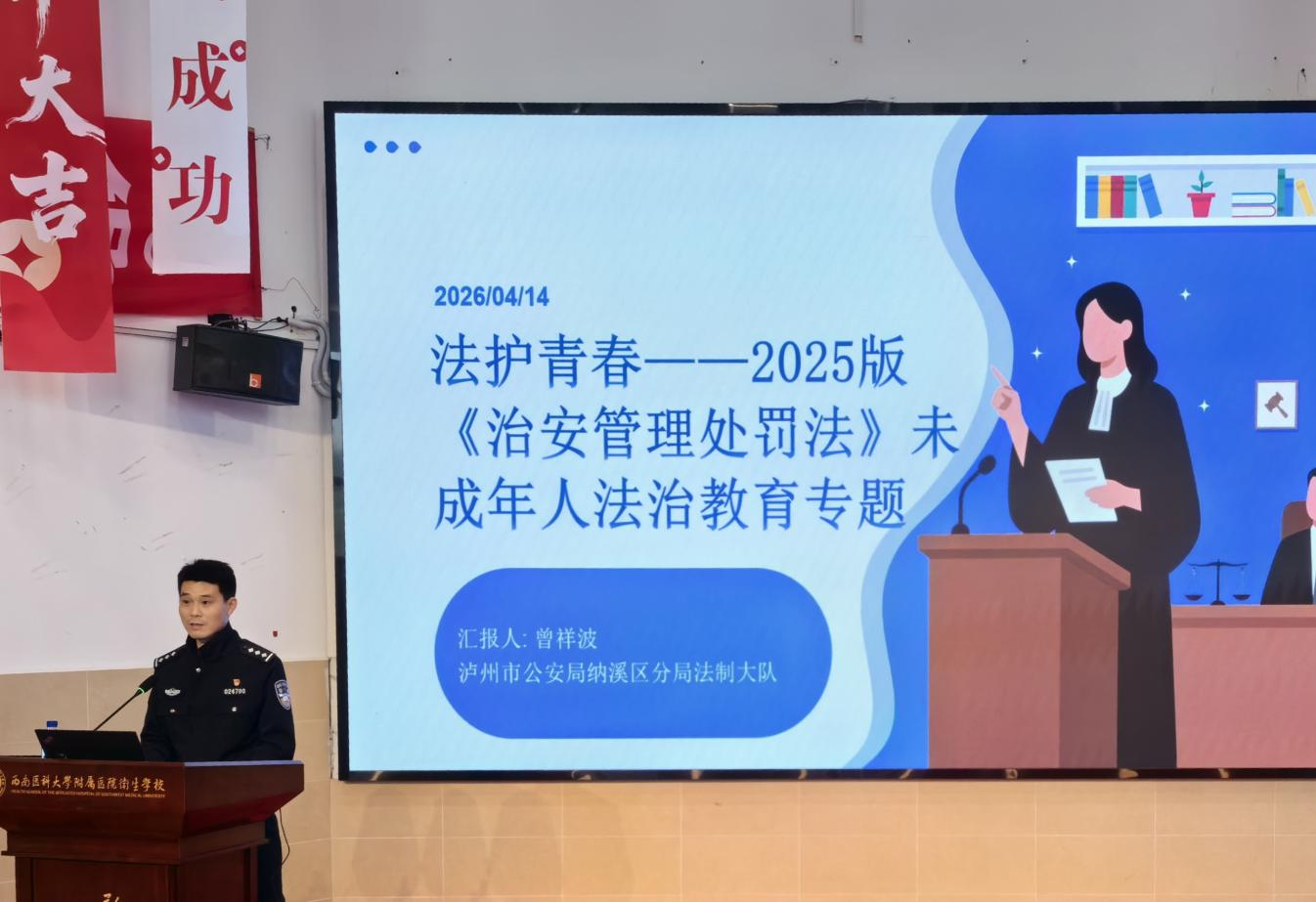 为持续深化警校协同育人,筑牢未成年人法治安全防线,抓实校园普法警示教育,4月14日,卫校特邀泸州市公安局纳溪区分局法制大队副大队长、卫校法治班主任曾祥波警官,开展2025新版《治安管理处罚法》未成年人专项法治宣讲,各班级学生代表参会学习。